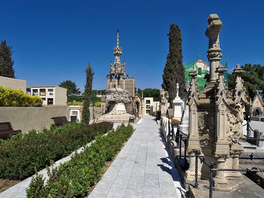 The cemetery in use and gives you the opportunity to be surprised by the beautiful sculptures. Sculptures made by famous architectures such as Josep Puig i Cadafalch, Antoni Gallissà i Soque, Vincente Artigas i Albertí or Bonaventura Conill i Mobtobbio. The tombs that the Indianos had built were also extravagant in every way. The crosses are richly decorated with flowers and there are different statues of angels around the graves.