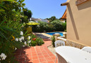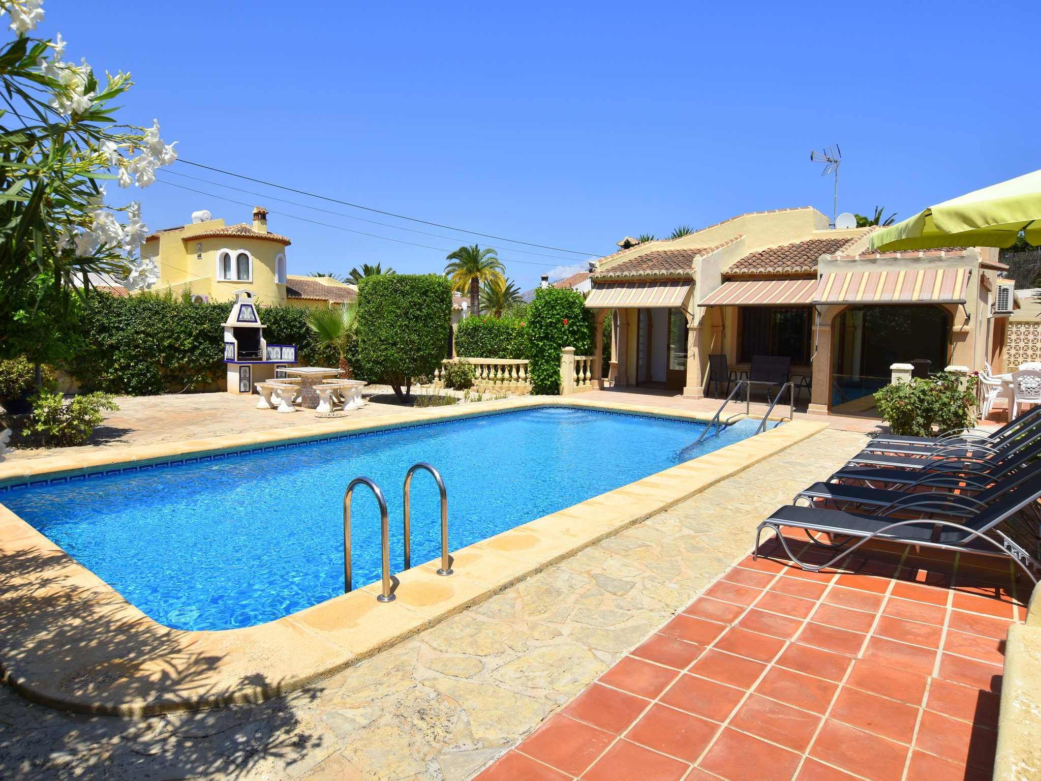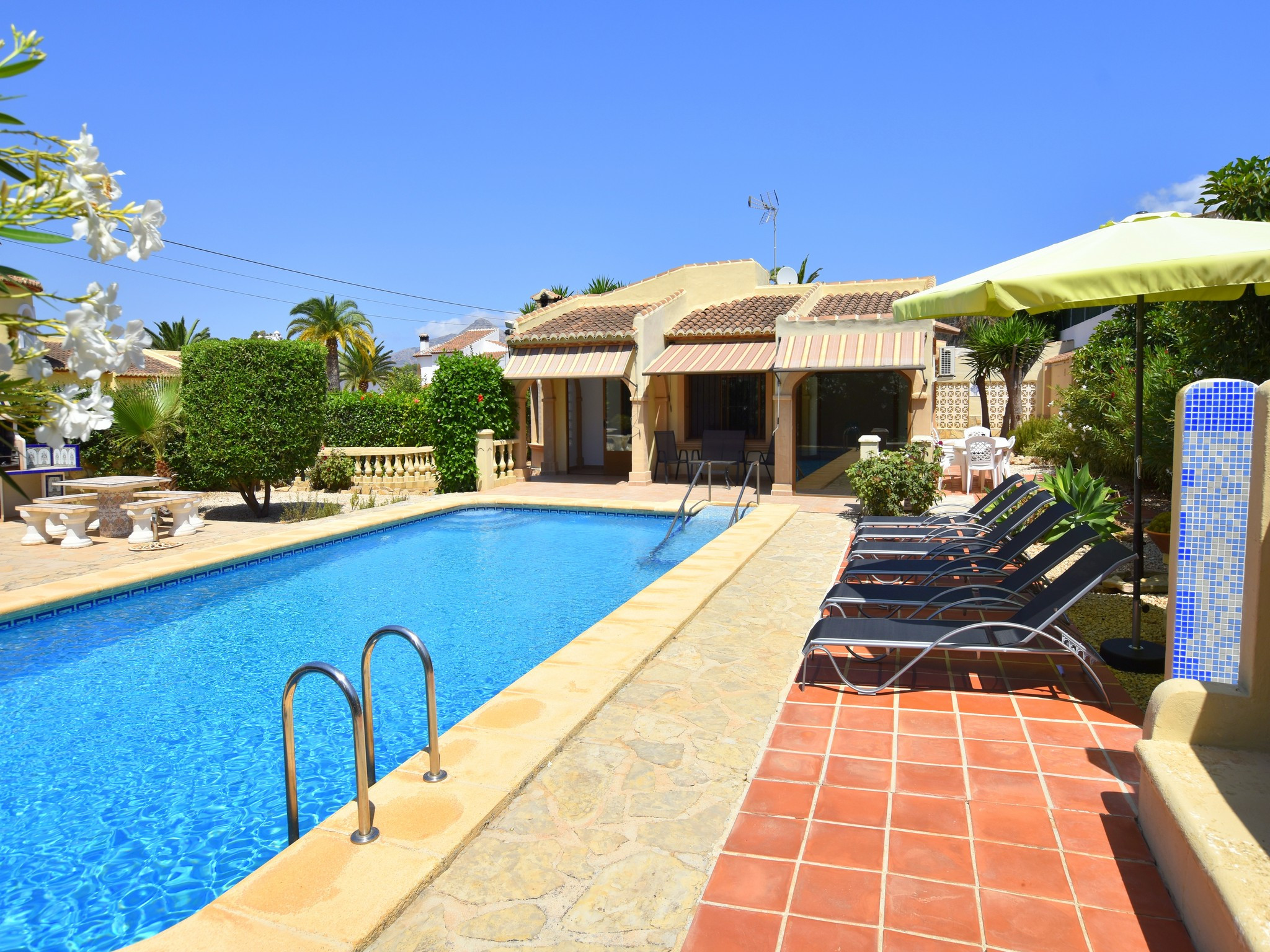 rent holiday home in javea Casa del Sol, holiday home for 6 people, 1 floor, Casa Viacien, for 6 people, 1-floor holiday home, is located in the urbanization Pinosol in Javea. Casa Viacien has internet, 3 bedrooms (1 with air conditioning), 4 bathrooms, living/dining- room with large sofa, flat screen TV, air conditioning, dining table with 6 chairs and access to the garden. There is a separate kitchen with gas hob, oven, filter coffee machine, dishwasher, microwave, toaster, kettle and fridge with freezer. The washing machine is in a bathroom. 10x5m private pool (suitable for wheelchair user). rent holiday home in javea Terrace next to the pool with 6 sun loungers, umbrella, outside shower, brick built barbecue and garden furniture. Next to the living room is a terrace with garden furniture and awnings. Casa Viacien has a surface of 150m2 on a fenced plot of 730m2. There is a parking place in the garden. Some restaurants and the Parc de les Cansalades (Children's Park and picnick area) in the surrounding area. Distance to the Arenal beach with shops, bars and restaurants: 2.5km. The villa is suitable for wheelchair users. Pets are allowed. rent holiday home in javea