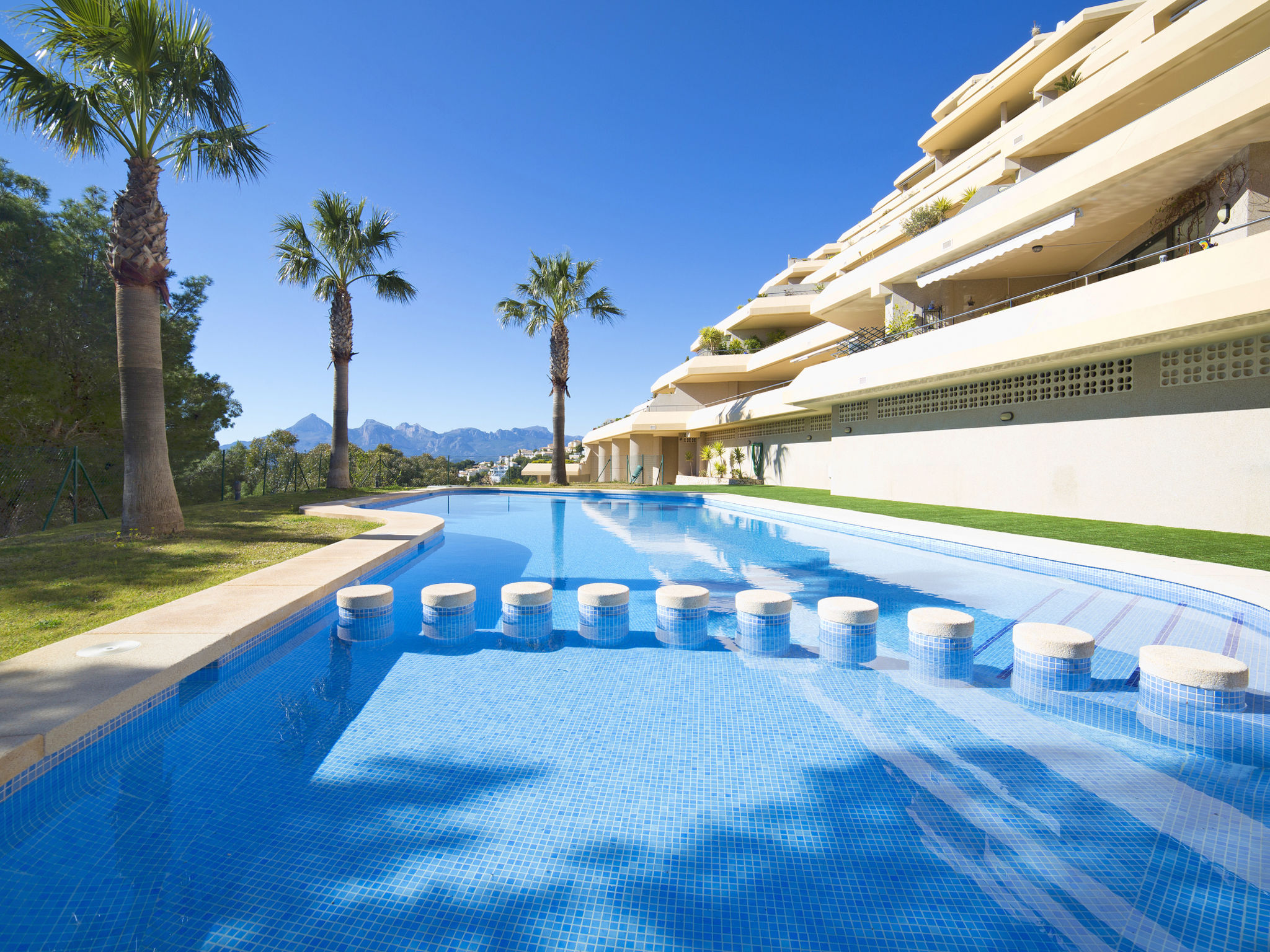 Sierra de Altea 2 km from Altea Hills: Large, very beautiful residence "Villa Marina Golf", 8 storeys. In the resort 6.8 km from the centre of Altea, 9.4 km from the centre of Calpe, in a quiet, sunny position, 3 km from the sea, 3 km from the beach. For shared use: property (fenced), 2 swimming pools (01.01.-31.12.). Shower/WC in the pool area, children's pool, terrace. In the house: lift. Roofed, parking on the premises. Supermarket 3.4 km, restaurant 1.6 km, pebble beach "Playa de la Roda" 7.1 km, rocky beach "Playa Mascarat" 3.9 km. Sports harbour 4.4 km, marina 4.4 km, golf course 3 km. Nearby attractions: Aqualandia, Mundomar, Terra Mítica, Terra Natura, Benidorm Palace (Benidorm).Availability