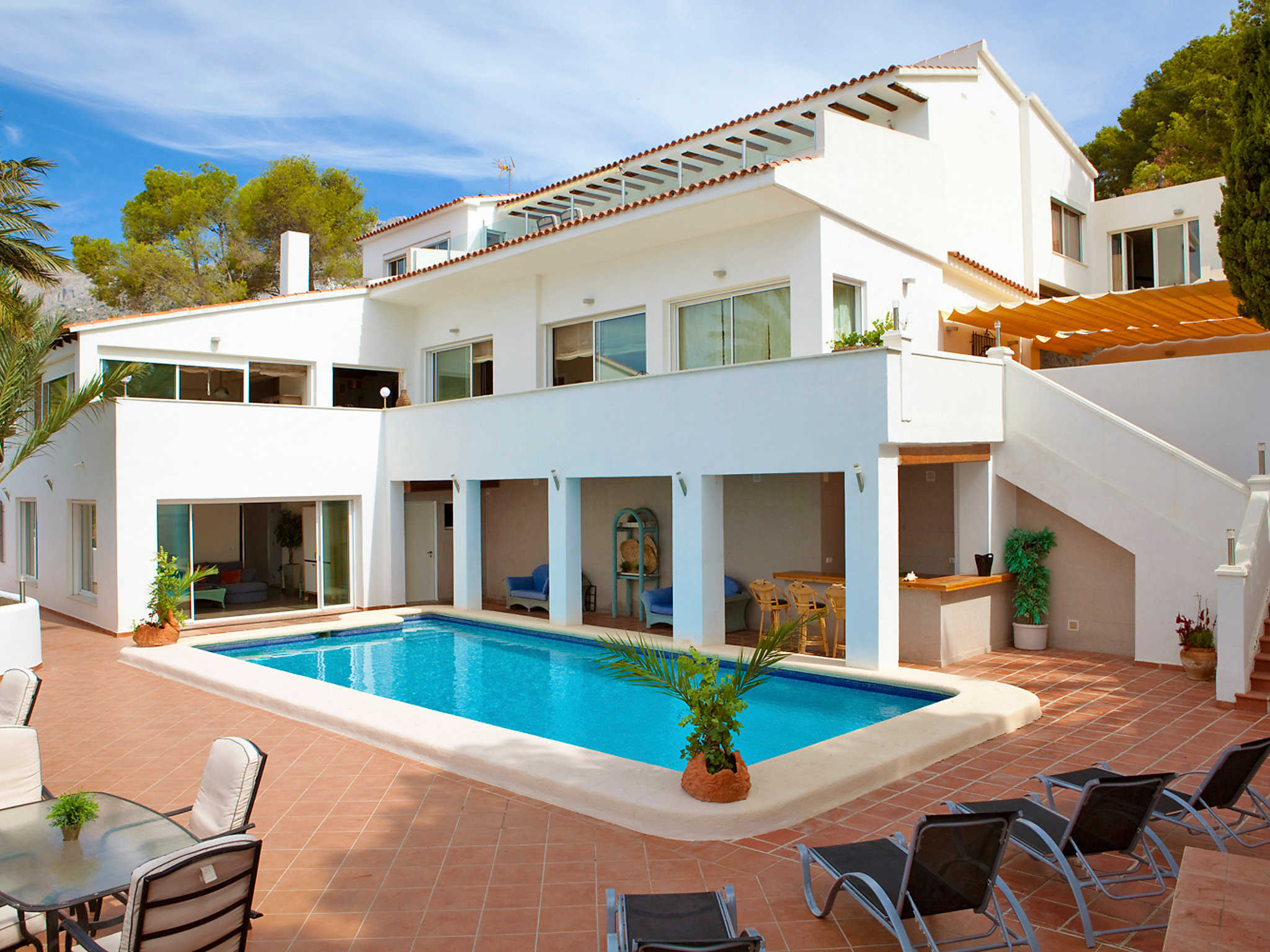 Galera del mar 3 km from Altea: Large, modern, cosy villa "Galera del Mar", 3 storeys. In a quiet position residential area (villas), 100 m from the sea. Private: property (fenced), terraced garden, natural garden, courtyard, swimming pool angular (01.01.-31.12.). Shower/WC in the pool area, pool house with fridge, pergola, terrace, garden furniture, barbecue. In the house: WiFi, air conditioning, washing machine, tumble dryer. Narrow motor access. Single garage space n 2. Supermarket, bar 300 m, sandy beach 1.5 km, shingle beach 200 m, swimming bay 300 m. Sports harbour 1.5 km, marina 500 m, surf school 1.5 km, sailing school 1.5 km. Nearby attractions: Aqualandia - Mundomar, Terra Mítica - Terra Natura, Benidorm Palace en Benidorm, Extra Service(Motorboat to rent)Extra. Please note: car recommended. Suitable for families, baby equipment (included). Suitable for events.