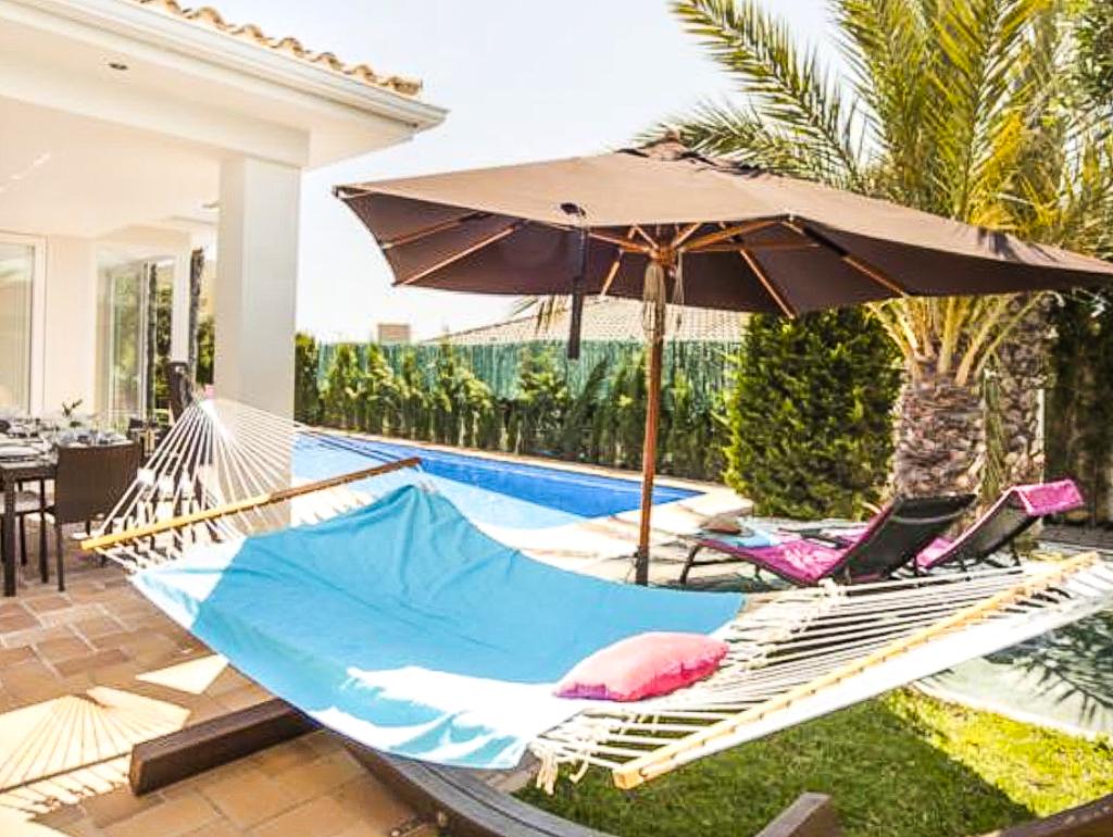 The accommodation is equipped with the following items: garden, garden furniture, fenced garden, 30 m² terrace, barbecue, iron, internet (Wi-Fi), air conditioning (hot/cold), air-conditioned, private swimming pool, open-air parking in the same building, 1 TV.