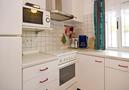 - kitchen with gas hob, microwave, refrigerator, coffee machine and toaster