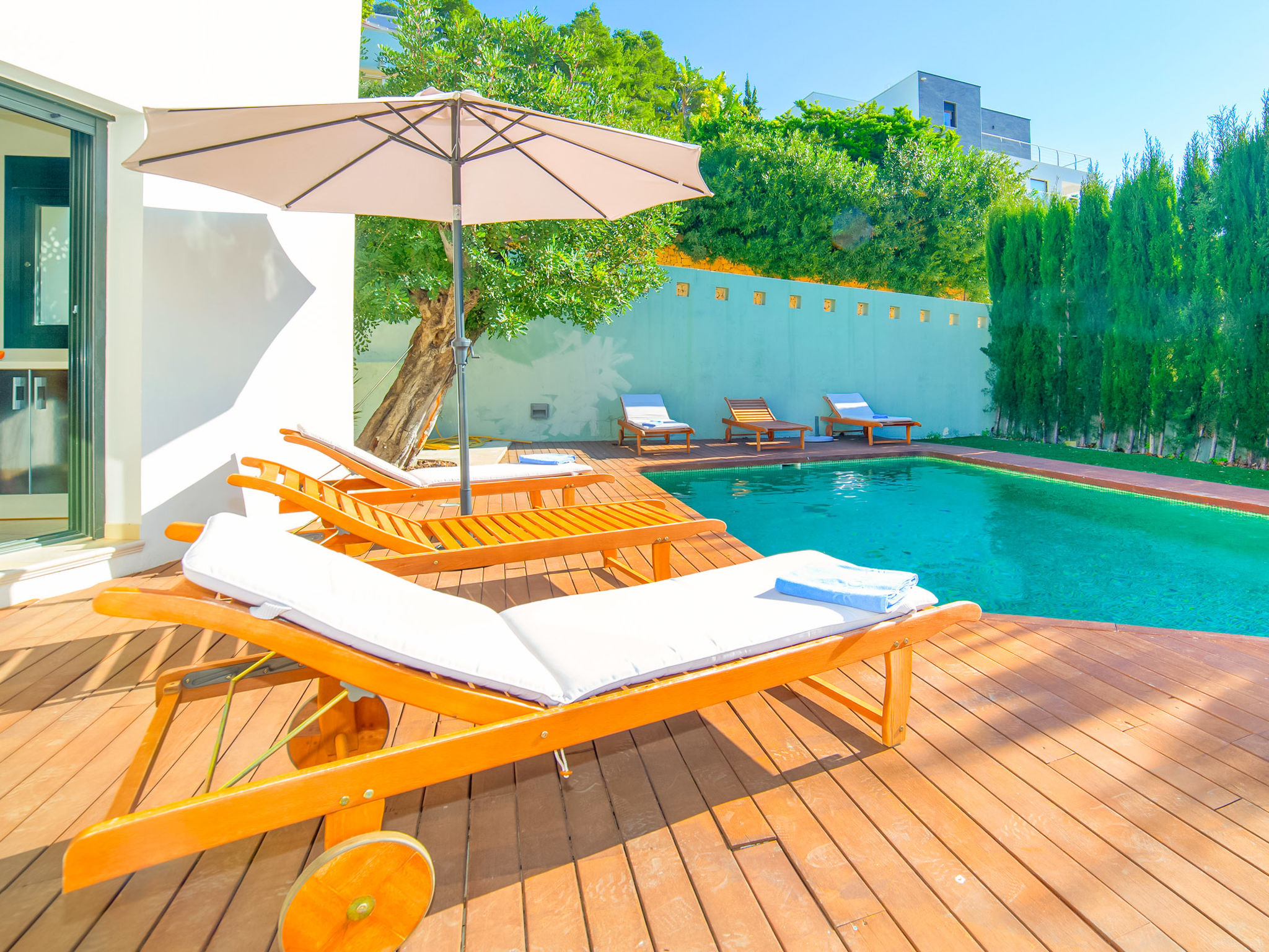 La Fustera: Large, modern house "Villa Bianca", 3 storeys. 6 km from the centre of Calpe, in a cul-de-sac. Private: property 800 m2, terraced garden, swimming pool (4 x 8 m, depth 100 - 180 cm, 01.01.-31.12.). Unconventional pool shape. Outdoor shower, barbecue. In the house: central heating system. Parking (for 3 cars) on the premises. Supermarket 2 km, restaurant 2.5 km, bar 2.5 km, sandy beach "La Fustera" 2.5 km. Sports harbour 3.5 km, golf course (9 hole) 7 km, surf school 3.5 km, sailing school 3.5 km, tennis 6 km. Nearby attractions: Aqualandia, Terra Mítica, Terra Natura, Mundomar, Benidorm Palace en Benidorm.Availability