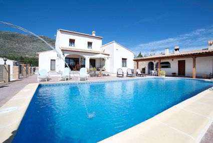 Benissa: Situated at the foothills of La Solana and Bernia mountains and with a wonderful view of the sea and the Peñón de Ifach house "Los Olivos", surrounded by trees and fields. 3 km from the centre of Benissa, in the district Benimallunt, in a quiet, sunny position. Private: property (fenced), swimming pool angular (5 x 10 m, seasonal availability: 01.Jan. - 31.Dec.) with salt-electrolysis pool-cleaning system. WC in the pool area, outdoor shower, barbecue house, parking at the house. Shop 2.5 km, supermarket 3 km, restaurant 2.5 km, bar 2.5 km, sandy beach "Calpe" 10 km, diving center 12 km. Sports harbour 10 km, sailing school 12 km, tennis 4 km, riding stable 4 km. Nearby attractions: Aqualandia, Terra Mítica, Mundomar, Terra Natura, Benidorm Palace (Benidorm). Situated in an ideal area for hiking.Availability