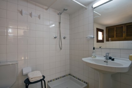 On the upper floor, you will find another cosy living-dining room with a fridge, sink and washing machine for your convenience. There is also a spacious bedroom with a double bed and a single bed, along with another full bathroom with a shower tray.