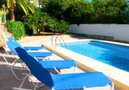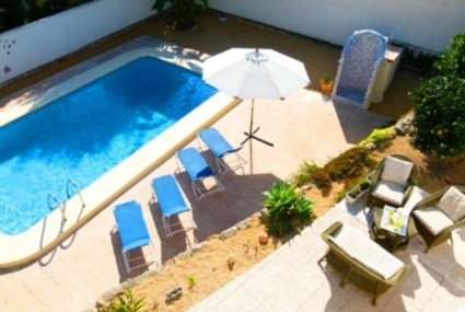 Halfway between Calpe and Moraira, in a beautiful corner of the coast of Benissa, about 2 kms from the sea. LAYOUT:Built on one floor, the south facing pool being a little lower. Living room, totaly equipped kitchen, double room with double bed with an en suite. A triple room (bunk beds and a single bed), one bathroom with shower. The kitchen opens to a covered terrace leading to the garden and pool. EXTERIOR: The plot, about 800 m2, fully fenced, is ideal for children, with orange trees and fruit trees. The pool area, surrounded by the garden, and sunloungers, has a toilet and enjoys plenty of privacy. Equipped with a portable BBQ. Ample parking for several vehicles. Solarium on the roof of the villa accessed by a spiral staircase has beautiful open views all the way to the sea. SITUATION: The villa enjoys a prime location (Montemar area), away from busy highways, it is tranquil and calm, but easily accessible. OTHER: Small pets are welcome.