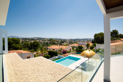 Benissa Costa: Very modern, beautiful villa "Casablanca", 2 storeys, built in 2017. 4.5 km from the centre of Moraira, 8.9 km from the centre of Calpe, in the district Buenavista, in a quiet, sunny position residential area (villas), 1.7 km from the sea, 1.7 km from the beach. Private: property 750 m2 (fenced), terraced garden, swimming pool angular (3 x 12 m, depth 30 - 150 cm, 01.01.-31.12.). Outdoor shower, pergola, barbecue house. In the house: washing machine. Parking (for 2 cars). Shop 3 km, grocery 3 km, supermarket 3 km, restaurant 2 km, bar 3 km, pub garden 1.6 km, sandy beach "Playa La Fustera" 2.9 km pebble beach "Cala Baladrar" 1.4 km, diving center 5.2 km, swimming bay 1.4 km. Sports harbour 5.4 km, golf course 3.7 km, surf school 5.4 km, sailing school 5.4 km. Nearby attractions: Aqualandia, Mundomar, Terra Mítica, Terra Natura, Benidorm Palace (Benidorm). Hiking paths: Peñon de Ifach.