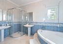 - en-suite bathroom with a double washbasin, bath, shower, and toilet