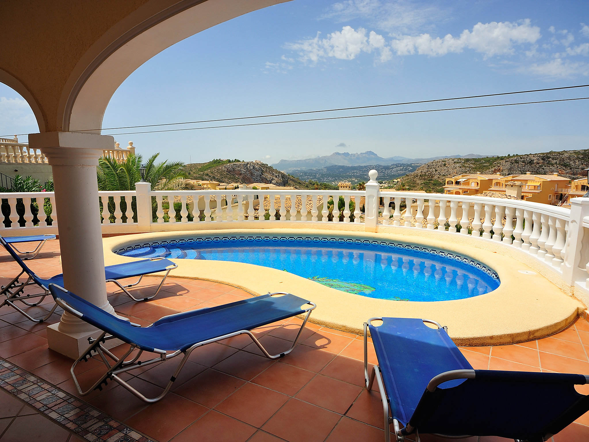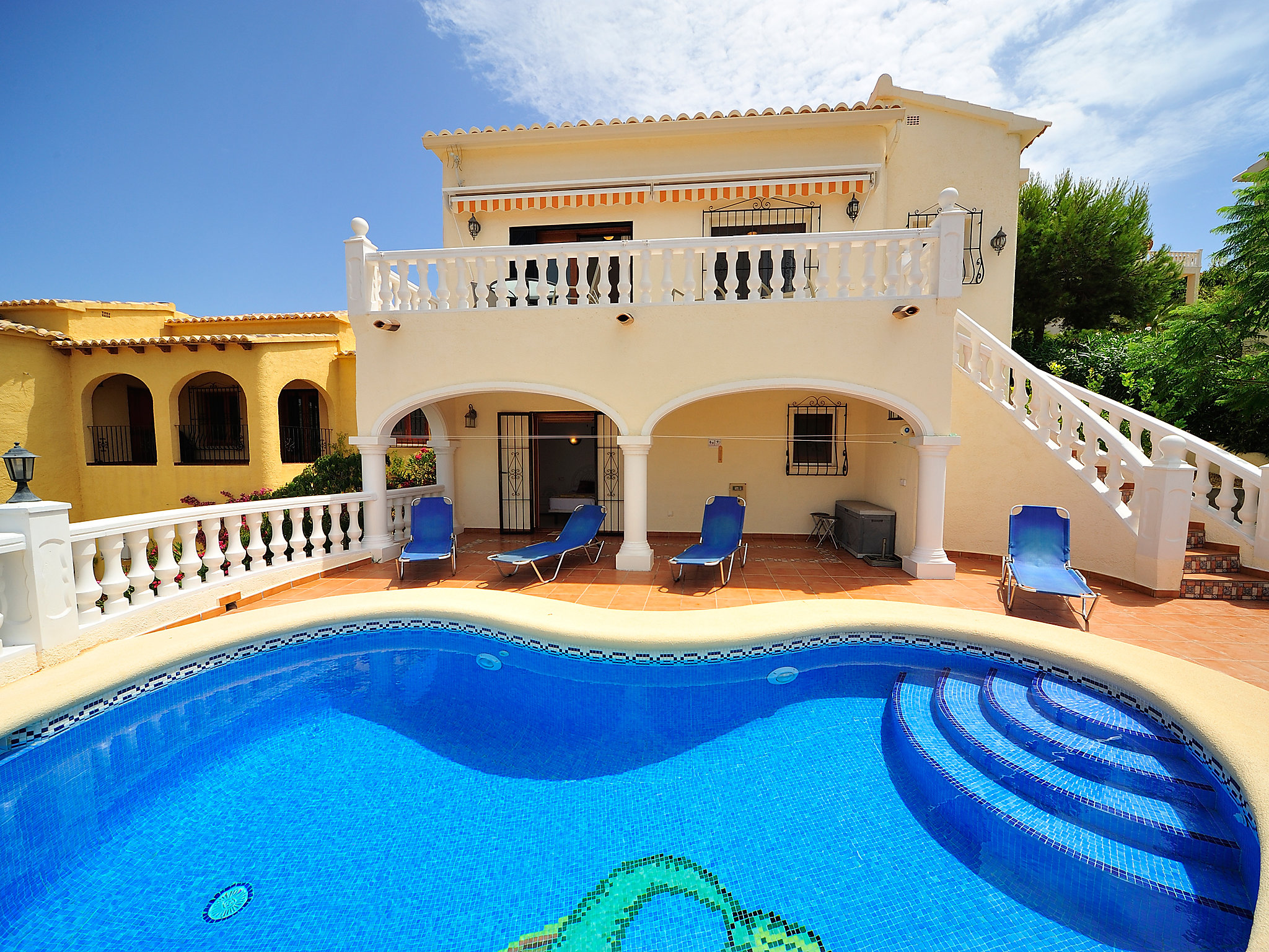 Benitachell: Single-family house "La Sirena", 2 storeys. In the district of Cumbre del Sol, in a quiet, sunny position on a slope, in the residential district, 1 km from the sea. Private: terraced garden, 440 m2 with wildlife garden, swimming pool kidney shaped (3 x 6 m, 01.01.-31.12.) with internal staircase. Public parking on the road. Supermarket 2 km, restaurant 200 m, sandy beach "Moraira" 5 km, shingle beach "Moraig" 1 km.