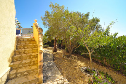 Benitachell: Beautiful house "Las Palmeras". In the district of Cumbre del Sol, in a quiet, sunny, elevated position in the residential district, 1 km from the sea. Private: beautiful, well-kept garden 850 m2 (fenced) with wildlife garden, swimming pool kidney shaped (4 x 8 m, 01.01.-31.12.). Outdoor shower. In the house: central heating system, air conditioning (extra). Stepped path (10 steps) to the house. Shop 800 m, supermarket 3.5 km, restaurant 800 m, sandy beach "Moraira" 6 km, swimming bay 1 km.