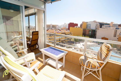 Practical and comfortable furnishings: living/dining room with digital TV, air conditioning and forced-air heating. Exit to the terrace. 1 room with 1 double bed, bath/bidet/WC and fan. Exit to the terrace. 1 room with 1 double bed and fan. Open kitchen (4 ceramic glass hob hotplates, microwave) with air conditioning and forced-air heating. Shower/WC. Beautiful view of the swimming pool and the city. Facilities: washing machine. AT-470530-A