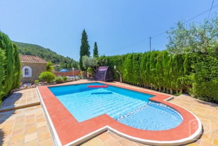 NICE HOLIDAY VILLA IN CALPE, for up to 7 persons and only 5 minutes drive from the sandy beaches of Calpe. This house is situated in a very quiet area : Monte Olta area, where you can go for a walk and discover this beautiful location or do some horse riding at the school situated at only 500 mts from the house. DISTRIBUTION: 2 floors house connected by an inside staircase. 1ST FLOOR: american kitchen, dining room, large living room, 3 bedrooms (5 single beds) and bathroom. 2ND FLOOR: large bedroom with en suite bathroom and access to a very large terrace with open views and the mountains and surrounding almonds fields. Large garden around the house with BBQ and eating area connected to the main kitchen. There is a pool with solarium. Lots of privacy. Large parking for several cars.