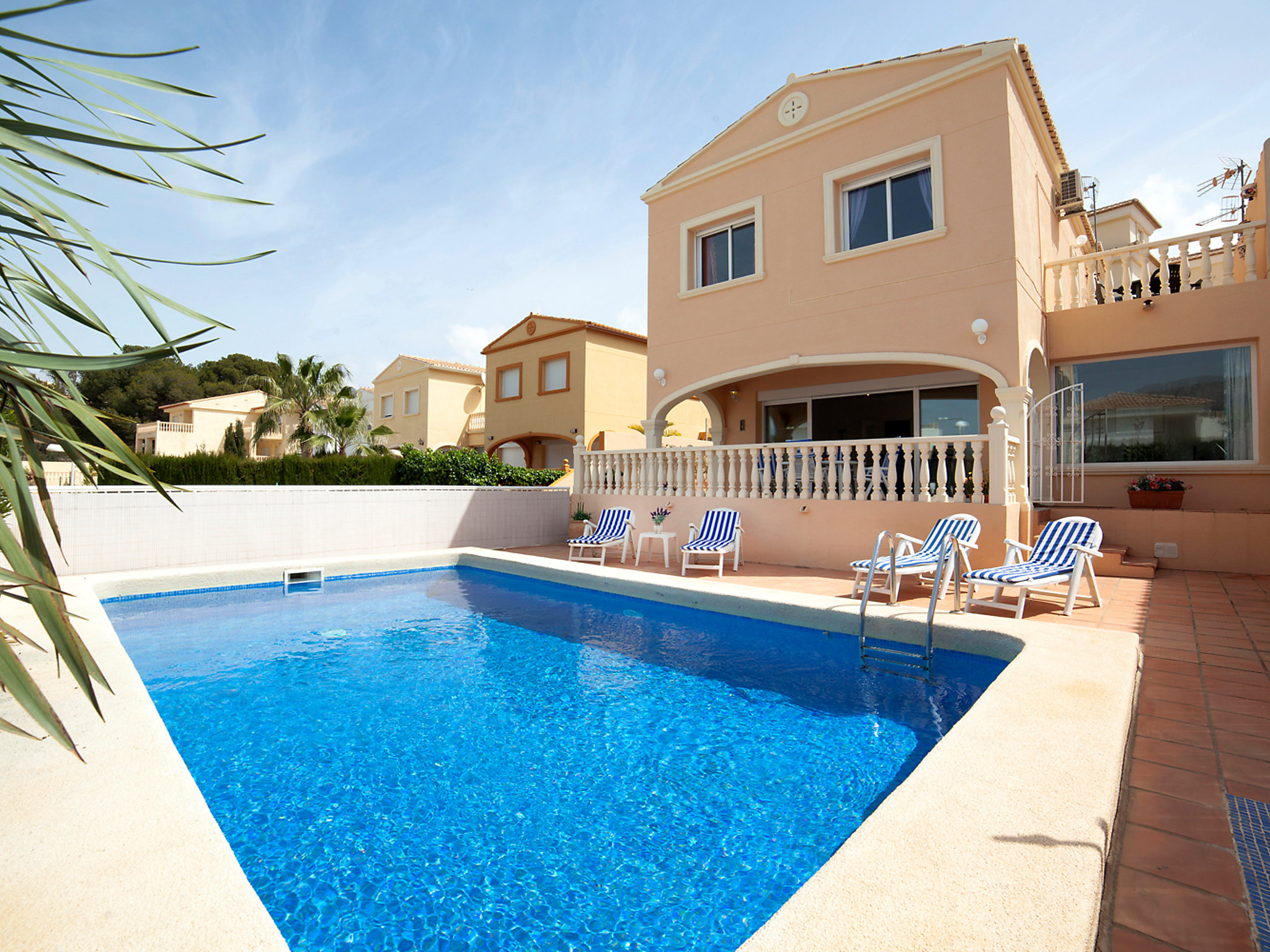 Casanova: Large, cosy house "Robela", 2 storeys, semi-detached. 1.5 km from the centre of Calpe, in a sunny position, 1.6 km from the sea, south-west facing position. Private: property 400 m2 (fenced), swimming pool secured (7 x 4 m, depth 110 - 180 cm, 01.01.-31.12.). Outdoor shower, pergola (8 m2), terrace, garden furniture. In the house: sun terrace, washing machine. Supermarket 1.2 km, shopping centre 1.4 km, restaurant 1.3 km, bar 1.3 km, sandy beach 1.6 km, diving center 3.7 km. Sports harbour 2 km, tennis 1.3 km. Nearby attractions: Aqualandia, Mundomar, Terra Mítica, Terra Natura, y Benidorm Palace (Benidorm).Availability