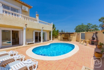 HOLIDAY VILLA FOR RENT IN CALPE (COSTA BLANCA) WITH PRIVATE SWIMMING POOL for up to 6 people. LAY OUT: the villa is spread over two floors connected by an internal staircase. Upstairs, we have two bedrooms (one with double bed and the other with twin beds) and a complete bathroom with bath, you can access a terrace with views on the natural Park of the Peñon de Ifach through one of the bedrooms. At the main floor, there is one bedroom (with twin beds) with an en suite bathroom (bath), a guest toilet in the hall and a separate kitchen with a table where you will have breakfast. Finally, we have an ample and bright living-dining room with leather sofas. OUTSIDE: the great swimming pool (kidney shape) is located on the terrace equipped with sun loungers, BBQ and an outdoor dining room covered by a pergola. The property access is through a sliding door and there is enough space to park our cars. SITUATION: the villa has a perfect location at 800m from the sea, the beach and all shops. At the beach area of La Fossa, there are many restaurants and bars and also the natural Park of the Peñon de Ifach from where you will enjoy the stunning views. OTHERS: AIR CONDITIONING IN TWO OF THE BEDROOMS, FREE INTERNET WI FI.