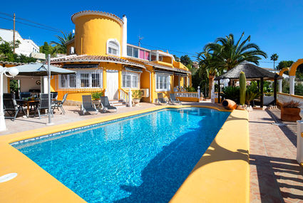 Very beautiful villa "LOasis", 2 storeys. In the resort 3.6 km from the centre of Calpe, in a secluded, quiet, sunny position residential area (villas), area with little traffic, 3 km from the sea, 3 km from the beach, in a cul-de-sac. Private: property 946 m2 (fenced), swimming pool (8 x 5 m, 01.01.-31.12.) with salt water. Outdoor shower, pool house with fridge and cooking stove, arbour, terrace, barbecue. Supermarket 2.7 km, restaurant 2.3 km, café 2.3 km, sandy beach "Playa de la Fosa" 3 km. Sports harbour 4.6 km, marina 4.6 km, golf course 9 km. Nearby attractions: Aqualandia, Mundomar, Terra Mítica, Terra Natura, Benidorm Palace (Benidorm). Please note: suitable for families. Groups of teenagers on request only. hydromassage bath (extra).Availability