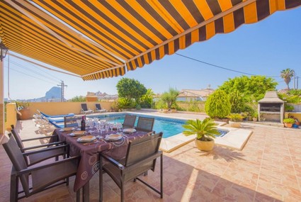 Modern-style-villa with private pool in Calpe, just 500 meters from the city center, with capacity for up to 8 people. This new building is located in the residential area Benicolada, very close to the center of Calpe, the beach, supermarkets and restaurants and is ideal for travelers who want to look for a high quality villa and want to enjoy their stay without using a vehicle.Walking distance to centre of Calpe. The villa extends over one level and therefore it is ideal for people with limited mobility. Outside you can enjoy the private swimming pool, barbecue and several terraces, which are partly covered. Inside there is a large living and dining area with modern furniture.