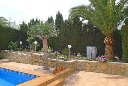 La Fustera: Cosy, comfortable villa "El Descanso", 2 storeys. 5.8 km from the centre of Calpe, in the district La Fustera, 900 m from the sea. Private: property 800 m2 (fenced), beautiful, well-kept garden, swimming pool (4 x 8 m, depth 100 - 180 cm, seasonal availability: 01.Jan. - 31.Dec.) with internal staircase. Outdoor shower, arbour, terrace, garden furniture, barbecue, barbecue house. In the house: central heating system, air conditioning. Stepped path (18 steps) to the house. Roofed, parking (for 2 cars) on the premises. Supermarket, restaurant, bar 500 m, bus stop "Parada Bus" 4.4 km, sandy beach 900 m. Sports harbour 3 km. Nearby attractions: Aqualandia, Mundomar, Terra Mítica, Terra Natura, y Benidorm Palace (Benidorm). Hiking paths: Peñon de Ifach. Part of the house is closed and unoccupied.Availability