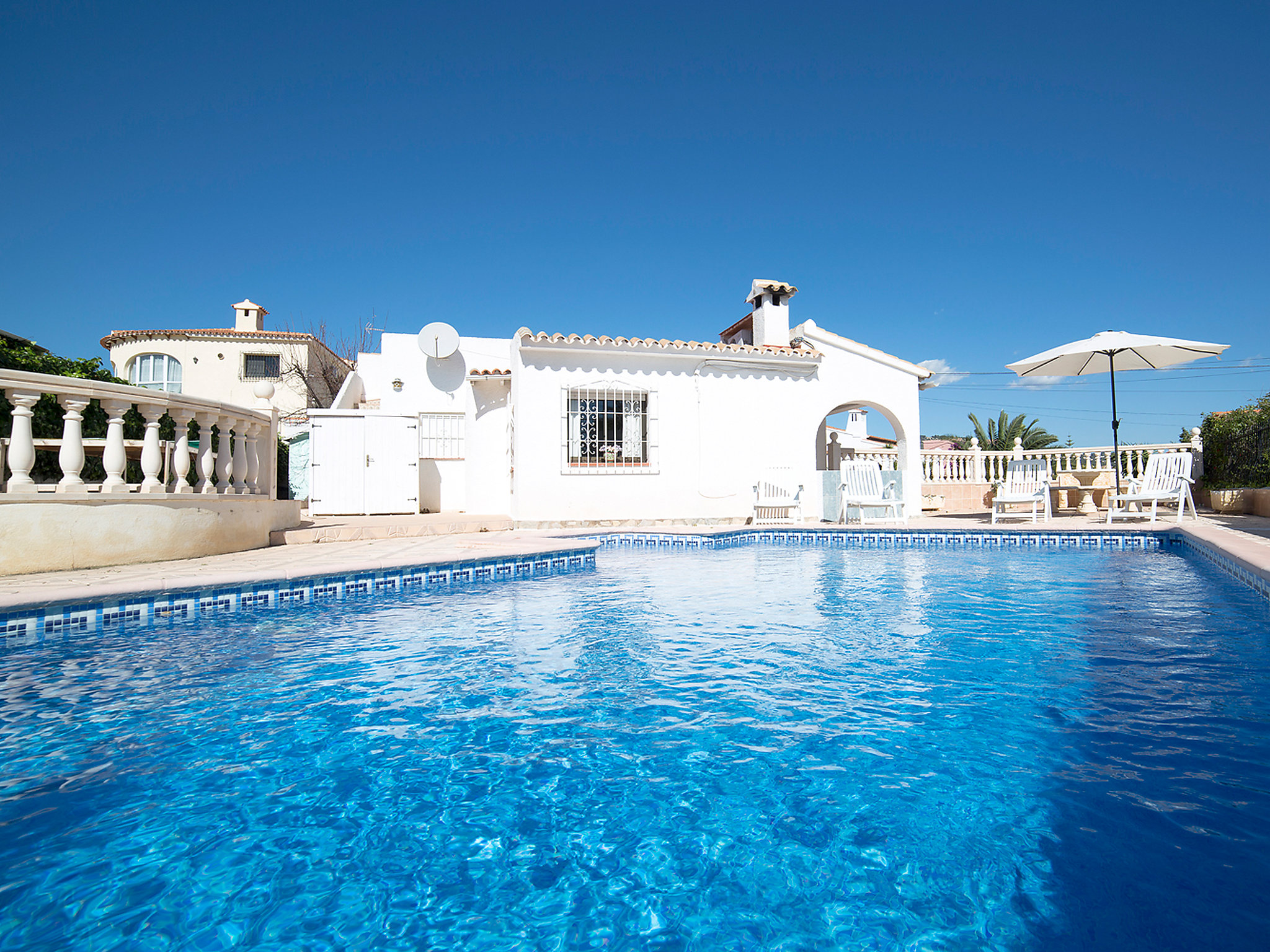 Ricarlos 3 km from Calpe: Cosy, comfortable single-family house "Cleo". In the resort 3 km from the centre of Calpe, in the district Ricarlos, in a quiet, sunny position residential area (villas), 1.5 km from the sea. Private: property 600 m2 (fenced), swimming pool angular (4 x 8 m, seasonal availability: 01.Jan. - 31.Dec.). Outdoor shower, terrace, garden furniture, barbecue. In the house: roof terrace. Parking at the house. Supermarket 1 km, restaurant 1 km, bar 1 km, sandy beach 1.5 km. Sports harbour 2 km, marina 2 km, surf school 2 km, sailing school 2 km. Nearby attractions: Aqualandia, Mundomar, Terra Mítica, Terra Natura, y Benidorm Palace (Benidorm). Please note: suitable for families, suitable for seniors.Availability