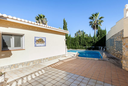 Santa Llúcia 2 km from Dénia: Very large, very beautiful, very comfortable villa "Zino", 2 storeys. Private: swimming pool (8 x 5 m, depth 80 - 220 cm, 01.01.-31.12.). Unconventional pool shape. Outdoor shower.Availability
