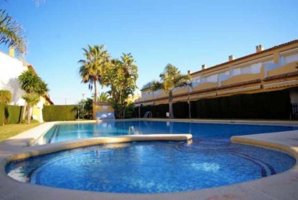 Bungalow of rent in Denia, Costa Blanca in zone of Las Marinas, inside an urbanization in the first line of beach, with capacity for 4 persons with community swimming pool and beautiful garden with lawn. Placed to only 200m. of the sandy, 1 km.of supermarkets and restaurants and 5km.of Denia town. Consists of private terrace with access to the swimmingpool, lounge dining room with satellite T.V., kitchen totally equipped (washing machine, vitrocerámica, oven, fridge/freezer, toaster, coffee machine) with 2 bedrooms and 2 bathrooms. Garden, Garden furniture, Terrace, Barbecue, Iron, 90 Property sqm, air conditioning in the living room, Swimming pool Communal (dimensions 10.00x5.00 m, opening date 1/1, closing date 31/12), covered car parking in the same building.