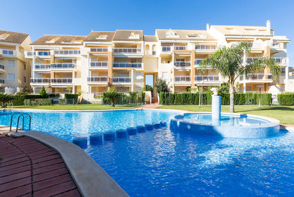Apartment block "Residencial Los Sauces". 4.5 km from the centre of Denia, 500 m from the sea. For shared use: large garden (fenced) with lawn and trees, swimming pool (01.01.-31.12.) with internal staircase. Children's pool, outdoor shower, children's playground (swing, sandbox). In the house: lift, air conditioning. Parking space n 2A, communal covered parking space n 2A. Supermarket, restaurant, bar, bus stop 300 m, sandy beach 500 m. Sports harbour 4 km, marina 4 km.Availability