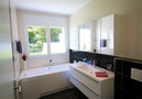 The bedrooms are also located in the same floor. We find three double bedrooms with air conditioner. One of the bedrooms has a big bathroom with shower and bathtube with swimming pool views. The second bathroom with shower is between the other two bedrooms.