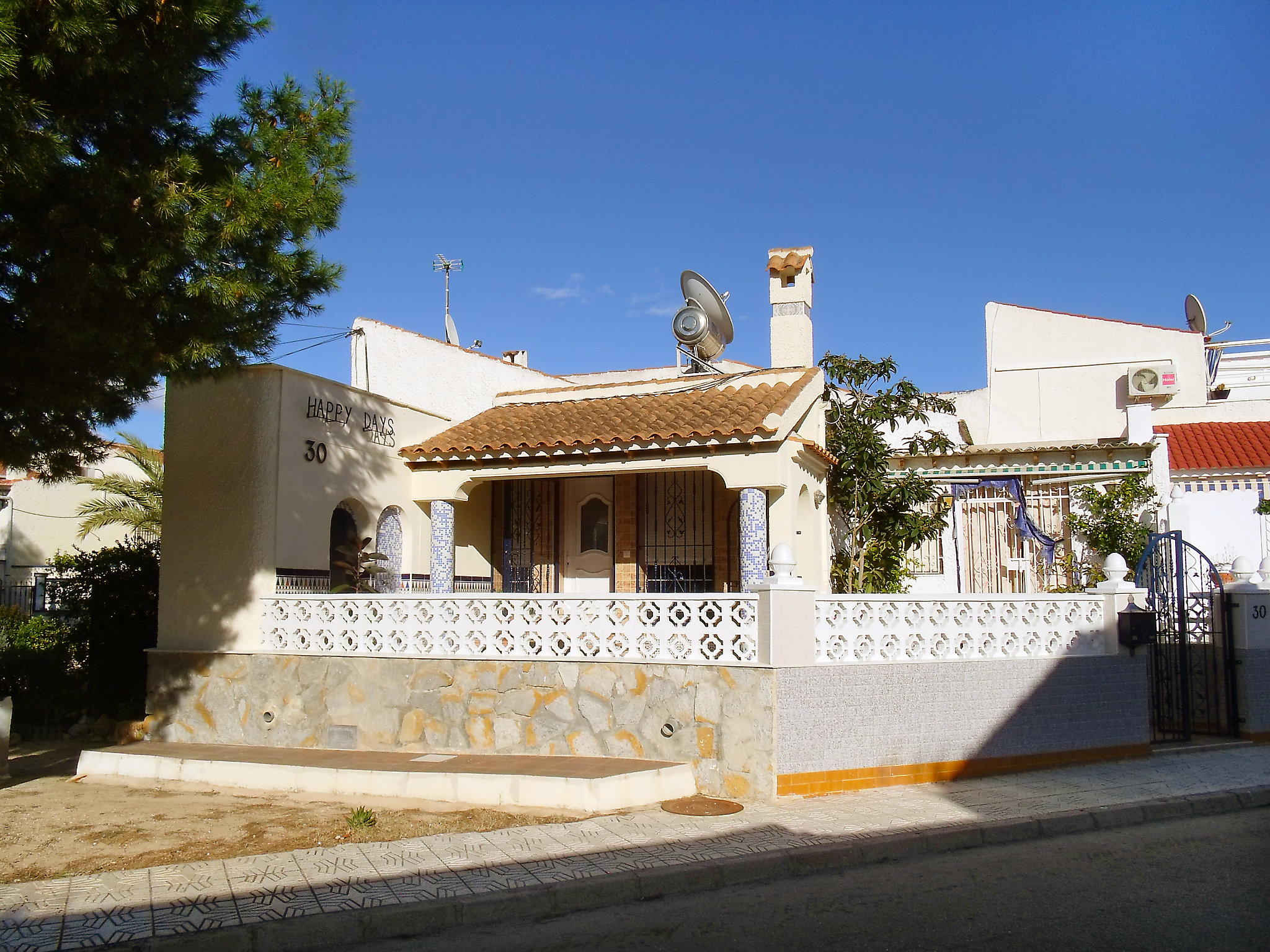 Urb. El Moncayo: Semi-detached house "Happy days". 3 km from the centre of Guardamar, 8 km from the centre of Torrevieja, 1.5 km from the sea, 1.5 km from the beach, in a cul-de-sac. Parking at the house. Supermarket 2 km, restaurant 2 km, bar 2 km, bus stop 200 m, sandy beach "Moncayo" 1.5 km. Golf course (18 hole) 10 km, tennis 50 m, children's playground 20 m. Please note: car recommended.