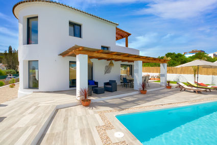 Very large, very modern, very comfortable villa "Sol & Relax", 2 storeys, built in 2020. In the district of Pinosol, in the resort 2.4 km from the centre of Jávea - Arenal, in a quiet position, 2.4 km from the sea, 2.4 km from the beach. Private: property (fenced), wildlife garden and trees, swimming pool (10 x 5 m, depth 110 - 210 cm, 01.01.-31.12.) with internal staircase. Outdoor shower, patio, pergola, barbecue, parking, single garage. Shop 450 m, supermarket 1.5 km, restaurant 400 m, café 450 m, sandy beach "El Arenal" 2.4 km. Sports harbour 6.5 km, golf course 2.5 km, surf school 3 km, sailing school 3 km, tennis 3.2 km.Availability