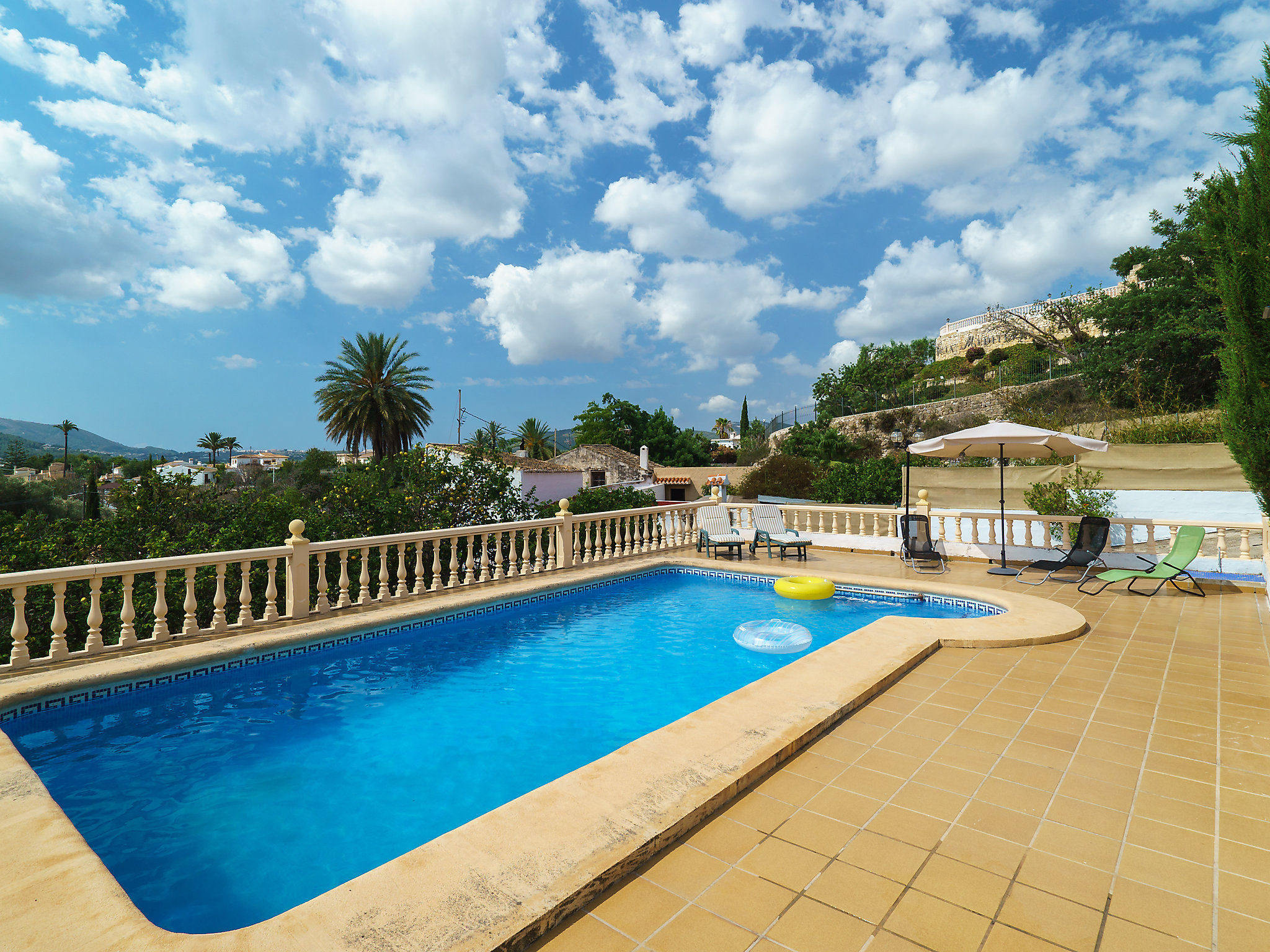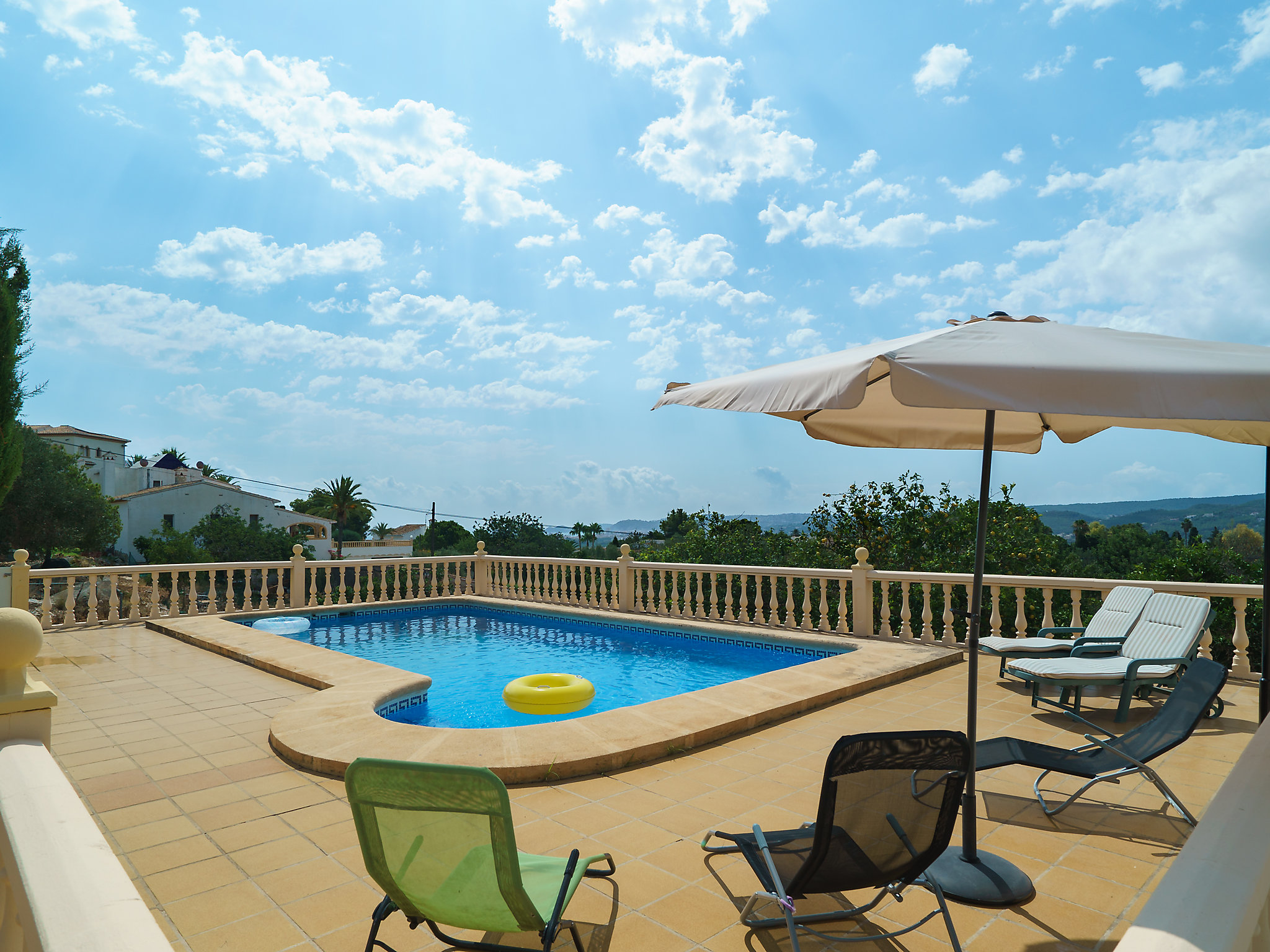 House "Leon". Above Jávea, in the district of Castellans, in a quiet, sunny, elevated position, 2.5 km from the sea. Private: garden 4'000 m2 (fenced) wildlife garden, orchard, swimming pool (4 x 9 m, 01.01.-31.12.) with internal staircase. Supermarket 1 km, restaurant 600 m, sandy beach "Arenal" 3 km pebble beach "Platja de la Grava" 2.5 km.Availability