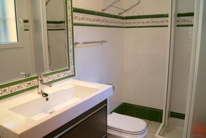 - bathroom with single washbasin, shower and toilet