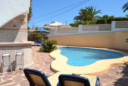 rent villas in javea Casa Cigales in Jávea set out on 1 floor, for 6 persons, has internet, 3 bedrooms, 2 bathrooms, air-condtioning in the living/room and a private swimming-pool of 8x4 m. Poolterrace with 4 sun beds, bar with sink and outside shower. Casa Cigales in Jávea. has a surface of 110 m2 on an enclosed plot of 860 m2 and is situated in a Residential area Toscal in Jávea. rent villas in javea The villas has a living/dining-room with 2 couches, dining table with 6 chairs, flatscreen TV, DVD Player, air-con and access towards the garden and private pool. And a American kitchen with ceramic hob, oven, dishwasher, microwave, fridge freezer, cooffee percolator, kettle and toaster. From the covered terrace with garden furniture, is view on the mountain Montgó, in the distance. The distance to the Arenal beach with shops, restaurants and bars is 2,5 km. Pets are not allowed. rent villas in javea