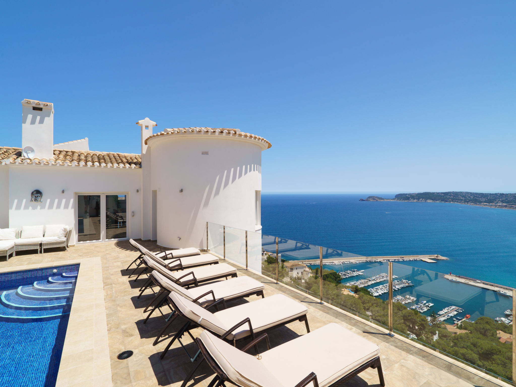Villa Las Nubes is a beautiful striking, contemporary style villa, blessed with the most breathtaking and enviable sea views that the Costa Blanca has to offer, overlooking the affluent town of Jávea, the valley and the mountains beyond. Las Nubes is perfect for your hollidays. It was reformed in 2012 to the highest standard and has every possible amenity for today’s most discerning lifestyles. It truly is one of the most magnificent houses in one of the most sought after areas on the Costa Blanca. Las Nubes, Cuesta San Antonio is sat on a plot of 1760 m2 with spectacular sea views overlooking the port of Jávea. Boasting 2 swimming pools, indoor (6 x 3) and outdoor (4 x 10), a fully equipped cinema, bar/games and gymnasium, with a sauna and separate hammam. Remot control motorizied car turntable. Villa "Las Nubes". 2 km from the sea. Private: 2 swimming pools (depth 160 - 160 cm, 01.01.-31.12.). Shower/WC in the pool area. In the house: lift, roof terrace, air conditioning. Supermarket 3 km, restaurant 2 km, sandy beach "Arenal" 5 km pebble beach "La Grava" 2 km. Marina 2 km, sailing school 2 km. Groups of teenagers on request only.