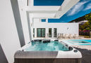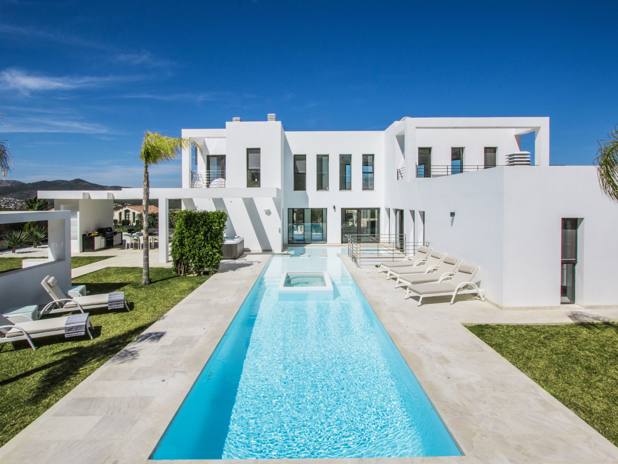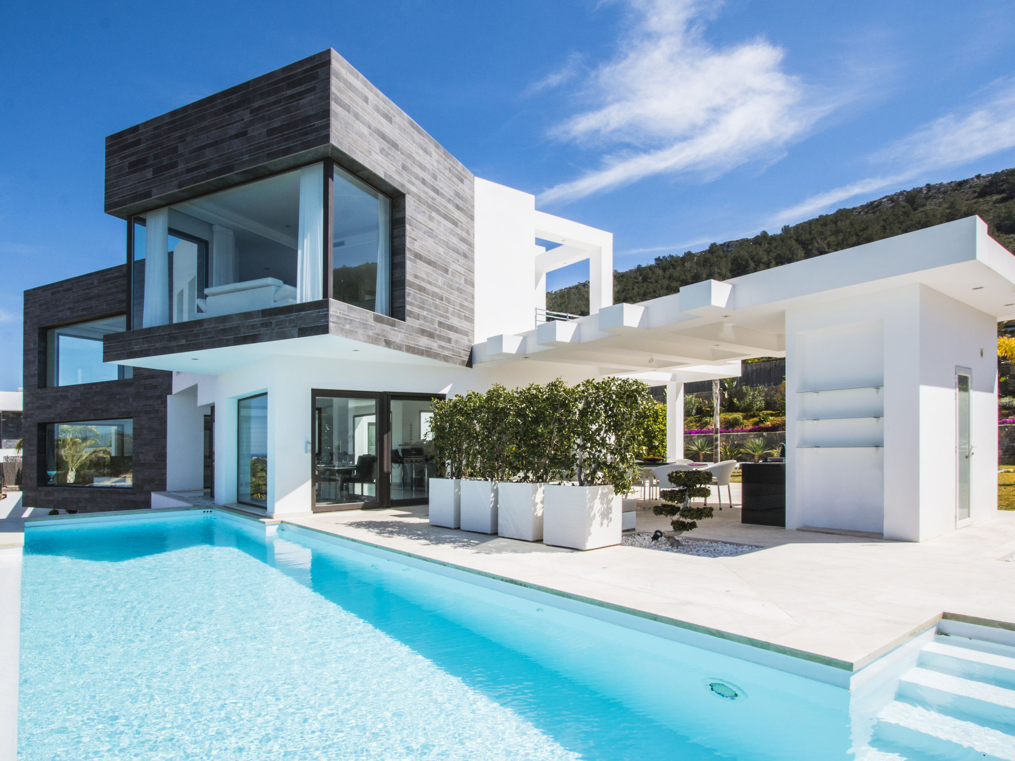Living like a Movie Star. Very modern, luxurious villa "High Energy", 3 storeys. In the district of Villes del Vent, in a quiet, sunny position residential area (villas), 4 km from the sea. Private: garden 1'100 m2 (fenced) with lawn and wildlife garden, 3 swimming pools (01.01.-31.12.). Shower/WC in the pool area, whirlpool. In the house: steam room. Supermarket 2 km, restaurant 2 km, sandy beach "Arenal" 4 km. Golf course (9 hole) 3 km, tennis 3 km. Groups of teenagers on request only. One pool 4 x 12 m with build in steps. One pool 3 x 15 m with build in steps. One heated indoor pool 2 x 6 m with counter-current system.Availability