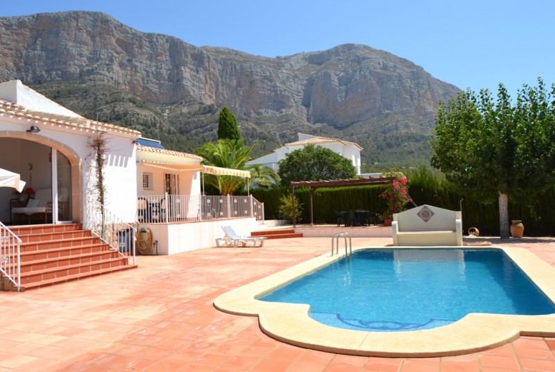 rent villas in javea Casa Paulina in Javea, set out on 1 floor, holiday home for 6 persons, with internet, air-conditioning, has 3 bedrooms, 3 bathrooms and a private swimming-pool with salt water, of 8x4 m. Casa Paulina has a kitchen with ceramic hob, oven, dishwasher, microwave, fridge freezer, washing-machine, toaster, kettle and coffee percolator. From the kitchen is access towards one of the terraces with garden furniture. Casa Paulina has a living/dining-room with 2 sofas, dining table with 6 chairs, air-con, flat screen TV, DVD Player and acess to conservatory. The surface of Casa Paulina is 180 m2, on a plot of 1.200 m2 and the villa is situated in the urbanization Montgó Toscamar en Jávea. rent villas in javea Supermarket and some restaurants in the surrounding areas. The distance to the Arenal beach with shops, restaurants and bars is 8 km, to the Golf Club La Sella: 4 km. Casa Paulina has stunning views on the mountain Montgó. Pets are not allowed. rent villas in javea