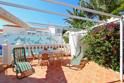 La Nucia 5 km from Benidorm: Large, simple house "De las Rosas 352". On the outskirts, 5 km from the centre of La Nucia, outside the resort, 5 km from the centre of Benidorm, in a quiet, sunny position, 5 km from the sea, 5 km from the beach. Private: property 240 m2 (fenced), beautiful garden, orchard, swimming pool (3 x 9 m, depth 140 - 150 cm, seasonal availability: 01.Jan. - 31.Dec.). Outdoor shower, garden furniture, barbecue, parking at the house. Supermarket 2 km, restaurant 2 km, bar 2 km, bus stop "Benidorm" 2 km, railway station "Benidorm" 4 km, sandy beach "Benidorm" 5 km. Golf course (18 hole) 5 km, walking paths from the house 800 m. Nearby attractions: Aqualandia 7 km, Mundomar 7 km, Benidorm Palace 7 km, Terra Mitica 5 km, Terra Natura 5 km, Alicante 40 km. Please note: car recommended. Baby equipment on request. Groups of teenagers on request only.Availability