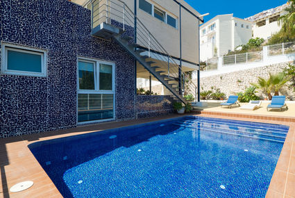 Large, beautiful villa "Villa Luz", 2 storeys. In the district of Cumbre del Sol 8 km from the centre of Moraira, in a quiet, sunny position in the residential district, 2.5 km from the sea, 2.5 km from the beach. Private: property 800 m2, swimming pool angular (4 x 6 m, 01.01.-31.12.) with internal staircase. Parking (for 2 cars) on the premises. Shop 2 km, supermarket 2 km, restaurant 2 km, bar 2 km, sandy beach "L'Ampolla Moraira" 8 km pebble beach "Cala Moraig" 2.5 km. Please note: car recommended.Availability
