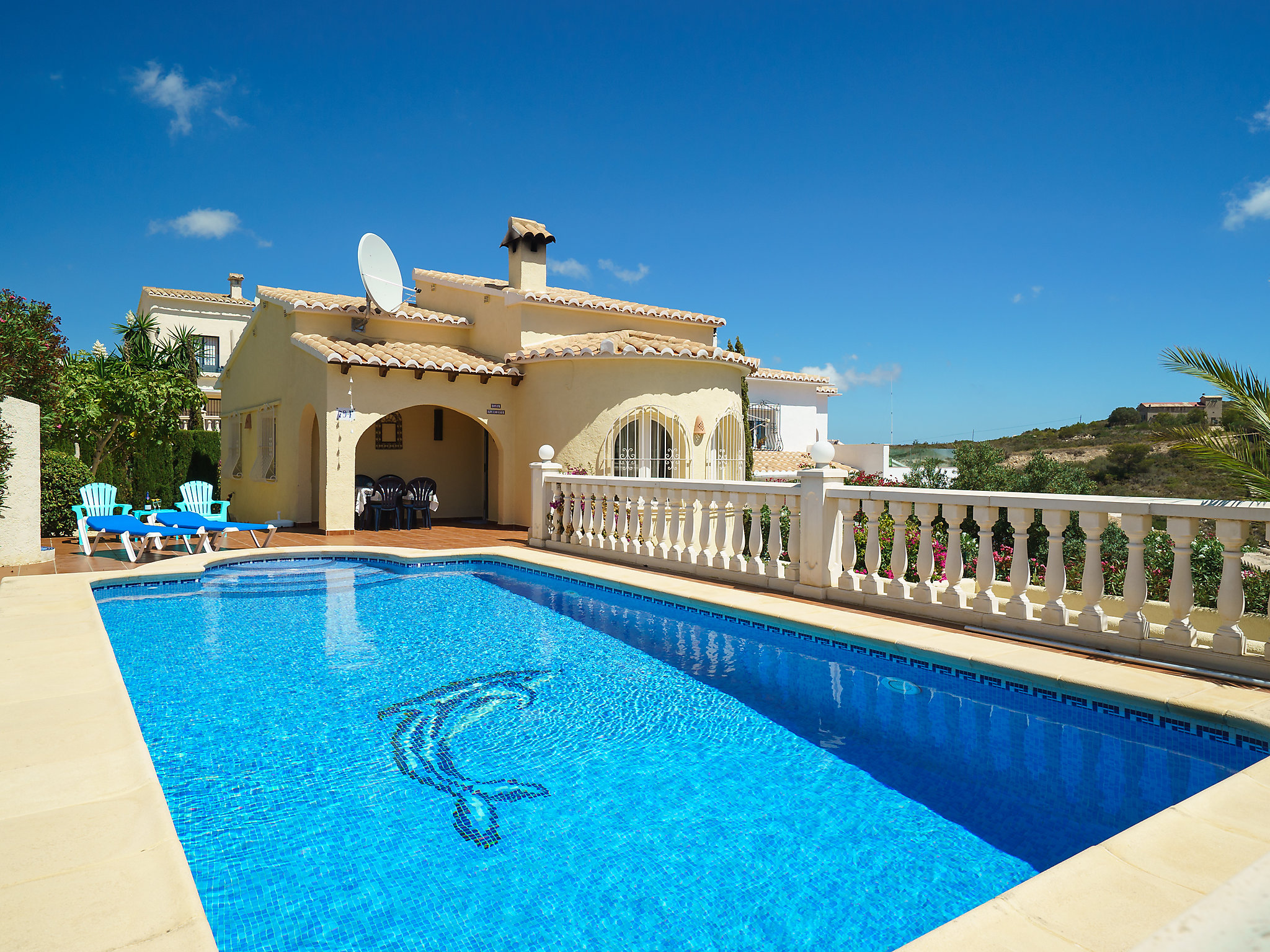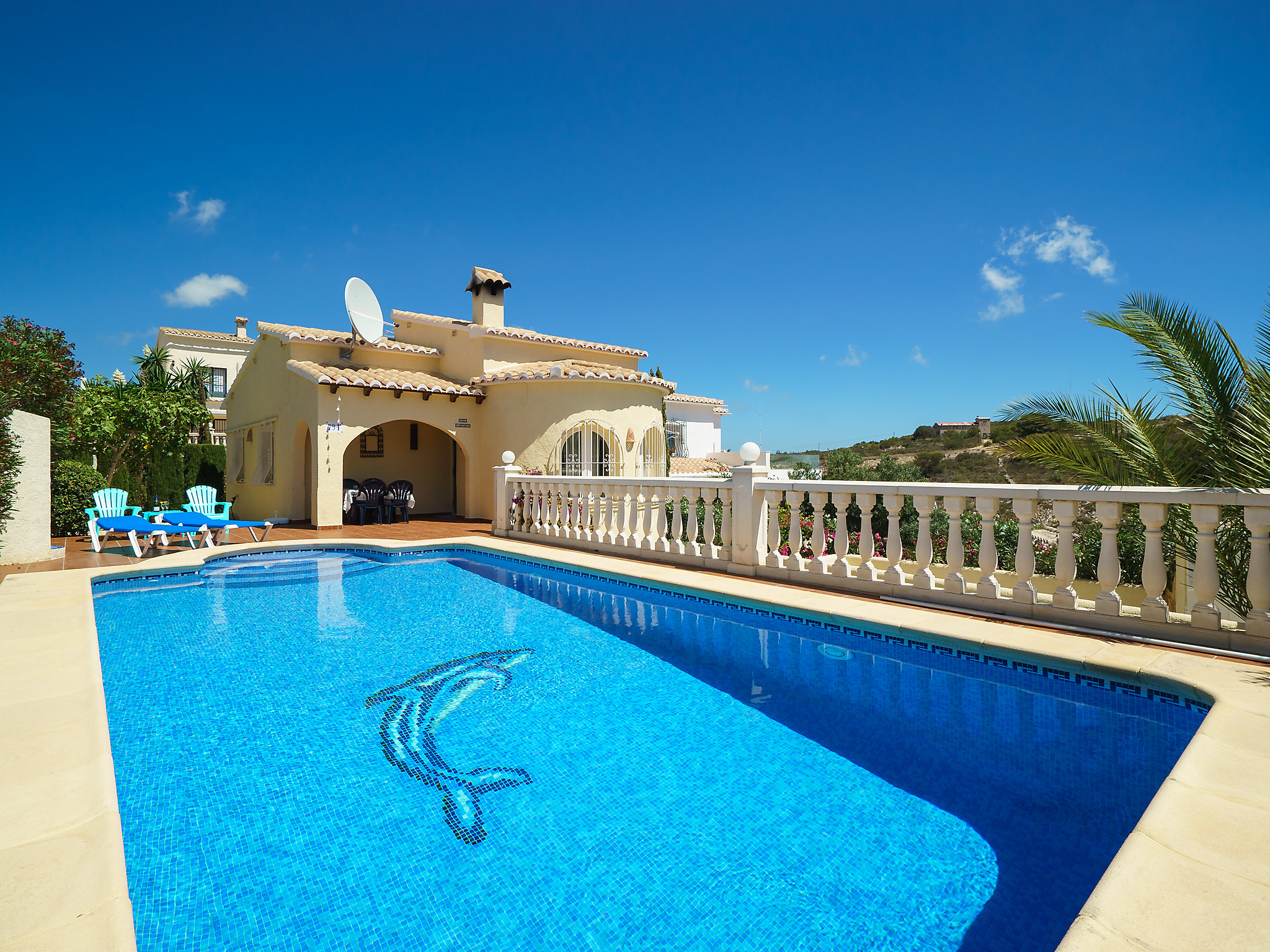 Very beautiful, comfortable house "Farniente". In the district of Cumbre del Sol, in a quiet, sunny position on top of a hill, 2.5 km from the sea, 2.5 km from the beach. Private: property 400 m2 (fenced), beautiful, well-kept garden, swimming pool angular (4 x 8 m, 01.01.-31.12.) with internal staircase. In the house: washing machine. Parking on the premises. Supermarket, restaurant 800 m, bar 400 m, sandy beach "L'Ampolla, Moraira" 9 km pebble beach 2.5 km. Please note: car recommended. Suitable for families, suitable for seniors.Availability
