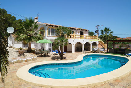 Child friendly, very beautiful, cosy house "Villa Paradise", 2 storeys, renovated in 2015. 1 km from the centre of Moraira, in a quiet, sunny position, 900 m from the sea, from the beach. Private: property 850 m2 (fenced), beautiful, well-kept garden, swimming pool kidney shaped, with privacy (10 x 5 m, seasonal availability: 01.Jan. - 31.Dec.) with internal staircase. Outdoor shower, pool house with fridge. In the house: air conditioning. Parking (for 2 cars) on the premises. Shop 2 km, supermarket 2 km, restaurant, bar 200 m, bus stop 2.5 km, sandy beach "Playa L'Ampolla" 1 km. Please note: car recommended. Suitable for families, suitable for seniors. The owner does not accept any youth groups. 1st floor is closed and not occupied. Part of the house is closed and unoccupied.Availability