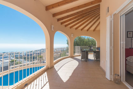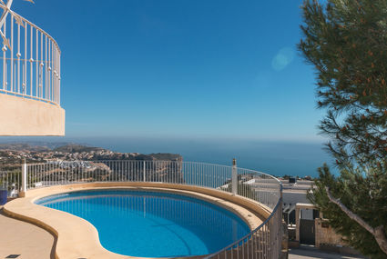 Very beautiful, comfortable house "La Gaviota". In the district of Cumbre del Sol, in a quiet, sunny position residential area (villas), 2 km from the sea, 2 km from the beach. Private: property, terraced garden, swimming pool kidney shaped, fenced (5 x 10 m, 01.01.-31.12.) with internal staircase. Parking on the premises. Shop 2.7 km, supermarket 2.7 km, restaurant 2.7 km, pebble beach "Cala Moraig" 2 km. Please note: car recommended. Suitable for families, suitable for seniors.Availability