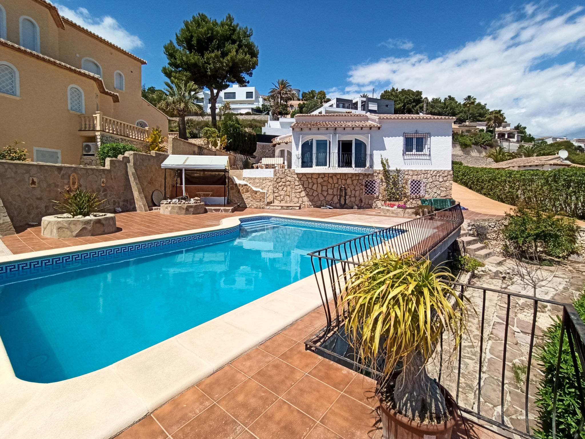 Benimeit: Beautiful house "Villa Pomelo". 4 km from the centre of Moraira, in a quiet, sunny, elevated position, 4 km from the sea, 4 km from the beach. Private: large, beautiful, well-kept garden with wildlife garden and trees, swimming pool angular (5 x 9 m, depth 110 - 160 cm, 01.01.-31.12.) with internal staircase. In the house: washing machine, tumble dryer. Parking (for 3 cars) on the premises. Shop 4 km, supermarket 2.2 km, restaurant 2.2 km, bakery 2.2 km. Please note: suitable for families, suitable for seniors.