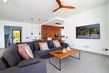 Spacious and bright, tasteful and stylish furnishings: living/dining room with dining table, TV, flat screen, air conditioning and forced-air heating. Exit to the terrace, to the swimming pool. 1 room with 2 beds (90 cm, length 190 cm), air conditioning and forced-air heating. 1 room with 1 french bed (150 cm, length 200 cm), shower/WC, TV, air conditioning and forced-air heating. Exit to the terrace. Open kitchen (oven, dishwasher, 4 induction hot plates, microwave, freezer, electric coffee machine, cooking island) with bar. Shower/WC. Underfloor heating (extra). Heating available only from 01.11. to 30.04. Upper floor: (open staircase), 1 room with 1 french bed (150 cm, length 200 cm), shower/WC, TV, air conditioning, fan and forced-air heating. 1 room with panoramic window Dressing room with 1 french bed (150 cm, length 200 cm), bath/shower/WC, TV, flat screen, air conditioning and forced-air heating. Exit to the loggia. Large terrace, porch. Terrace furniture, barbecue, deck chairs, covered balcony. Panoramic view of the sea and the countryside. Facilities: washing machine, dryer, iron, hair dryer. Internet (WiFi, free). Reserved parking (fenced 2 cars). Please note: suitable for families. Non-smokers only. AT-474864-A