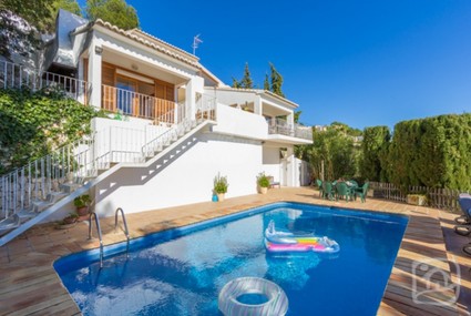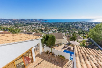 LAYOUT: This large villa beautifully decorated and with strong personality is spread over two floors and connected by an internal staircase. Upstairs we have three twin bedrooms and a bathroom. There is a very bright entrance hall overlooking the lower floor where the lounge is located. One of the bedrooms on this floor has a private terrace with panoramic views. Downstairs we have a large double bedroom which has a private lounge with fireplace and an ensuite bathroom. A large detached kitchen, fully equipped and a bright living room with access to the terrace . EXTERIOR: The terrace is on the same level as the dinig room and has nice outdoor furniture,from wich you can enjoy incredible panoramic views while dinning of the Mediterranean Sea and the town of Moraira. Also at this level is the barbecue. At a lower level is the pool surrounded by sun loungers and parasols. It has an outside toilet to avoid having to enter the house when out. The access to the villa we do through a sliding door where there is room to park two cars . LOCATION : Situated in a quiet development . A 5 minute drive from the beautiful town of Moraira. Where you can we find a wide selection of the best restaurants and a beautiful sandy beach with crystal clear water . OTHER : WIFI INTERNET. AIR CONDITIONNED IN THE BEDROOMS AND LIVING ROOM.