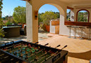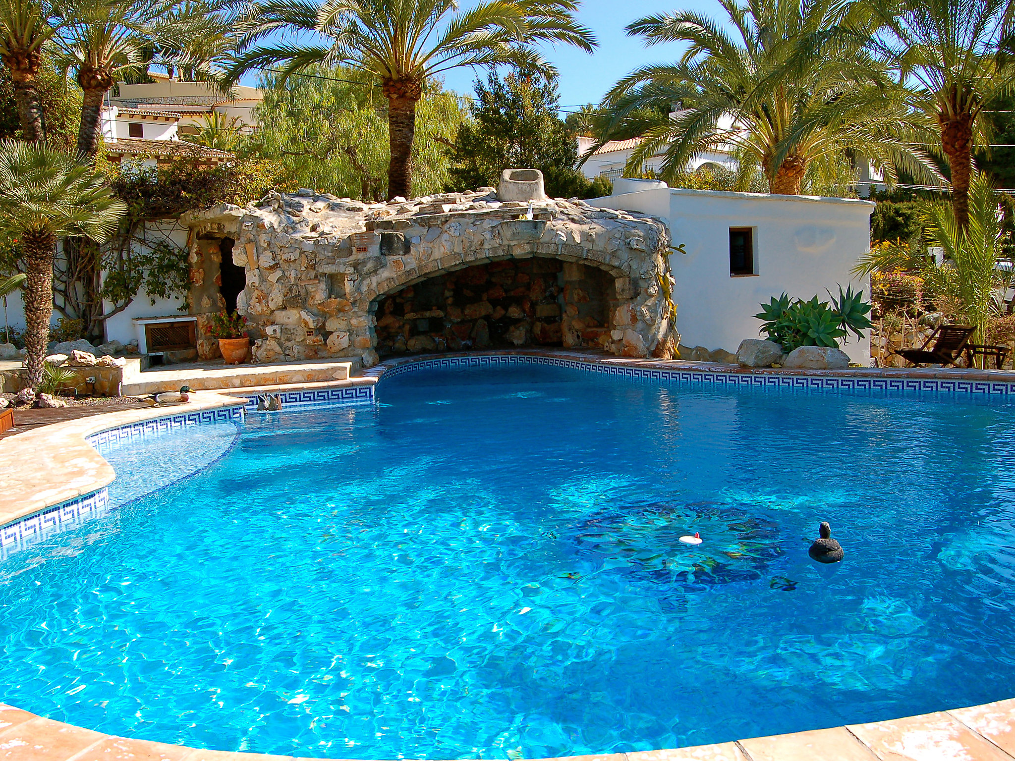 Montemar: Very comfortable, luxurious farm estate "Paris", 2 storeys. In the district of Montemar, 5 km from the centre of Moraira, in a quiet, sunny, elevated position, in a cul-de-sac. Private: property 3'700 m2 (fenced) with lawn and wildlife garden, beautiful garden to relax, swimming pool heated, with privacy (80 m2, 01.01.-31.12.) with internal staircase. WC in the pool area, pool house with shower and WC, terrace, garden furniture, barbecue house. In the house: sauna, fitness room, hydro massage bath (all included), table tennis, table football, central heating system, air conditioning, burglar alarm system, washing machine, tumble dryer. Supermarket 1.3 km, restaurant 1.3 km, bar 1.3 km, sandy beach 4.5 km. Golf course 9 km. Luxury villa with wonderful extras for guests: Private hidden from outside view - luxury with top technology - secure air conditioning. The swimming pool is an infinity pool with waterfall and massage jets. During the winter the minimum temperature is from 20-22 C, in April - October, the minimum temperature is from 25 C. Bar. Fully equipped summer kitchen, with griddle, dishwasher and ice maker. The sauna, 12 m2 is sufficiently big for 8 people. Water tank.