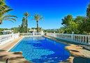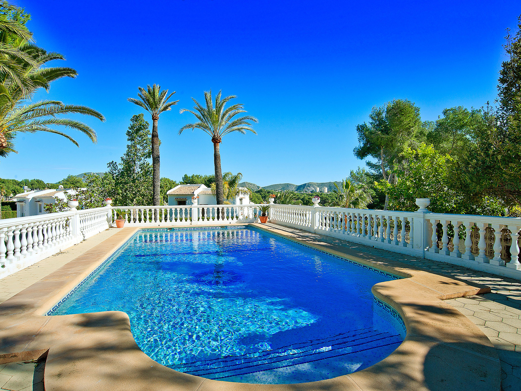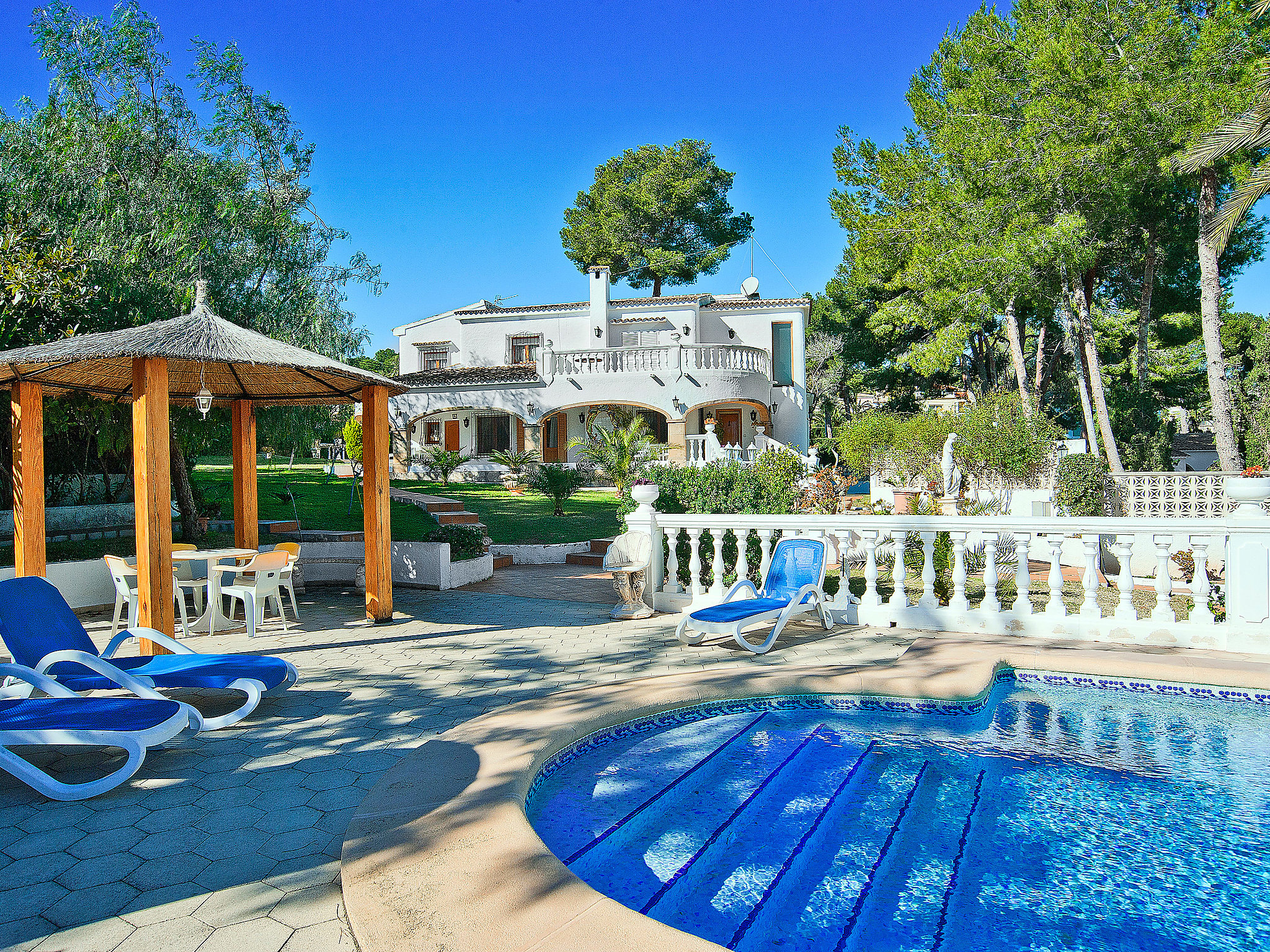 Very large, cosy villa "Villa el Pinar", 2 storeys. In the district of Moraira, 600 m from the centre, in a quiet, sunny position. Private: large, beautiful, well-kept garden 1'700 m2 (fenced) with lawn and trees, swimming pool angular (5 x 10 m, 01.01.-31.12.) with internal staircase. Outdoor shower. In the house: central heating system (extra). Roofed, parking on the premises. Shop 600 m, supermarket 1 km, restaurant, bar 150 m, sandy beach 400 m. Golf course 2.5 km.Availability