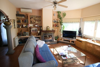Both access, through the garage and main entrance have a stair with some steps where we found the living rooms with Sat-tv, chimney and air condioner. The American kitchen has all the amenities you need like oven, microwave, big fridge with freezer, ceramic hob and wash machine.