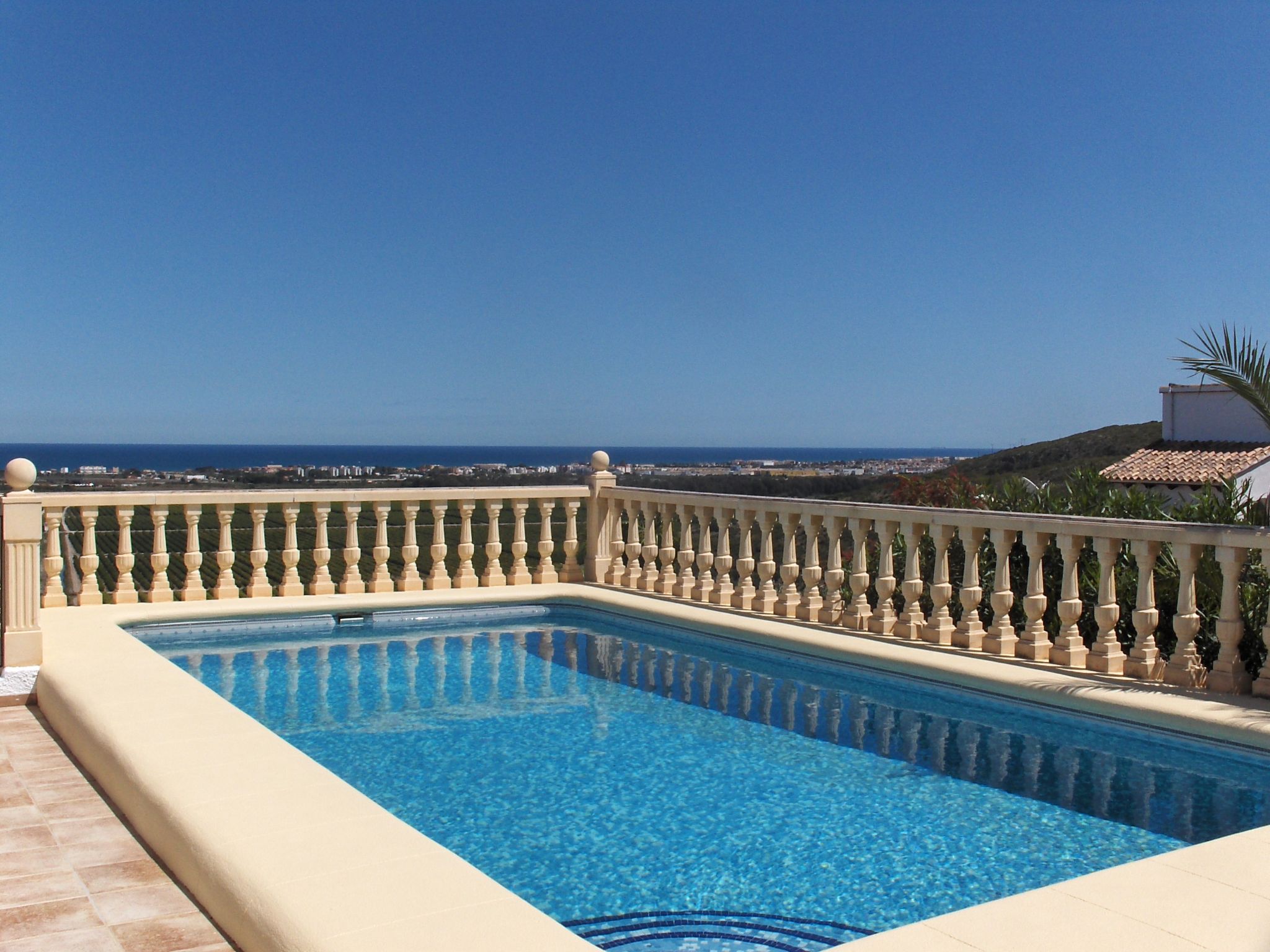 Cosy, comfortable house "Girasoles". In the district of Monte Pego, in a quiet, sunny position on top of a hill, 8 km from the sea, 8 km from the beach. Private: property 1'250 m2 (fenced), swimming pool angular (4 x 8 m, depth 100 - 180 cm, seasonal availability: 01.Jan.-31.Dec.). Outdoor shower, pool house with shower and WC. Shop 6 km, supermarket 6 km, shopping centre 12 km, restaurant, bar 300 m, sandy beach 8 km. Golf course 12 km, tennis 300 m. The owner does not accept any youth groups.Availability