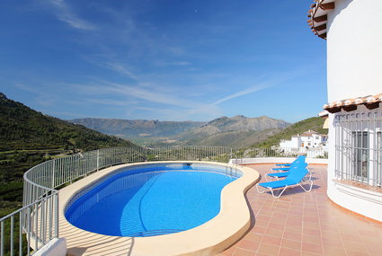 Very beautiful, comfortable house "Dali", built in 2007. In the district of Monte Pego, in a quiet, sunny, elevated position on a slope, 8 km from the sea, in a cul-de-sac. Private: property 2'000 m2, large, beautiful, well-kept garden wildlife garden, flowers and trees, swimming pool kidney shaped (10 x 5 m, depth 210 - 80 cm, 01.01.-31.12.) with internal staircase. Outdoor shower. In the house: sun terrace, air conditioning. Parking on the premises. Shop 5 km, supermarket 5 km, shopping centre 12 km, restaurant 1 km, bar 1 km, sandy beach 8 km. Golf course 12 km, tennis 1 km. The owner does not accept any youth groups.Availability