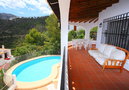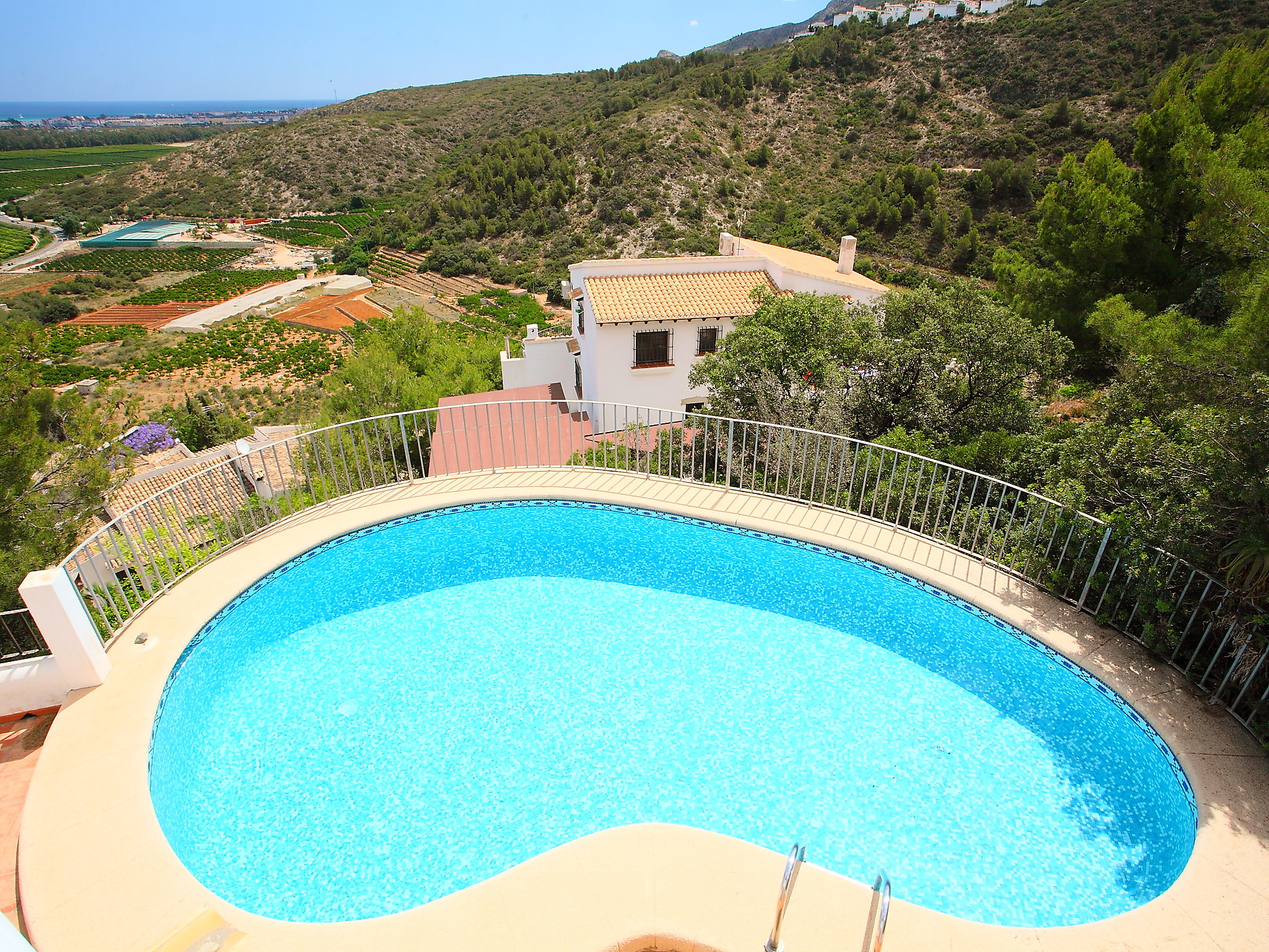 Monte Pego: Beautiful, cosy house "El Nido del Amor", 2 storeys. In the district of Monte Pego, in a quiet, sunny, elevated position, 8 km from the sea, in a cul-de-sac. Private: garden with flowers and trees, natural garden, swimming pool kidney shaped (4 x 8 m, 01.01.-31.12.). Stepped path (15 steps) to the house. Parking at the house on the premises. Shop 5 km, supermarket 5 km, shopping centre 12 km, restaurant, bar 300 m, sandy beach 8 km. Golf course 12 km, tennis 300 m.