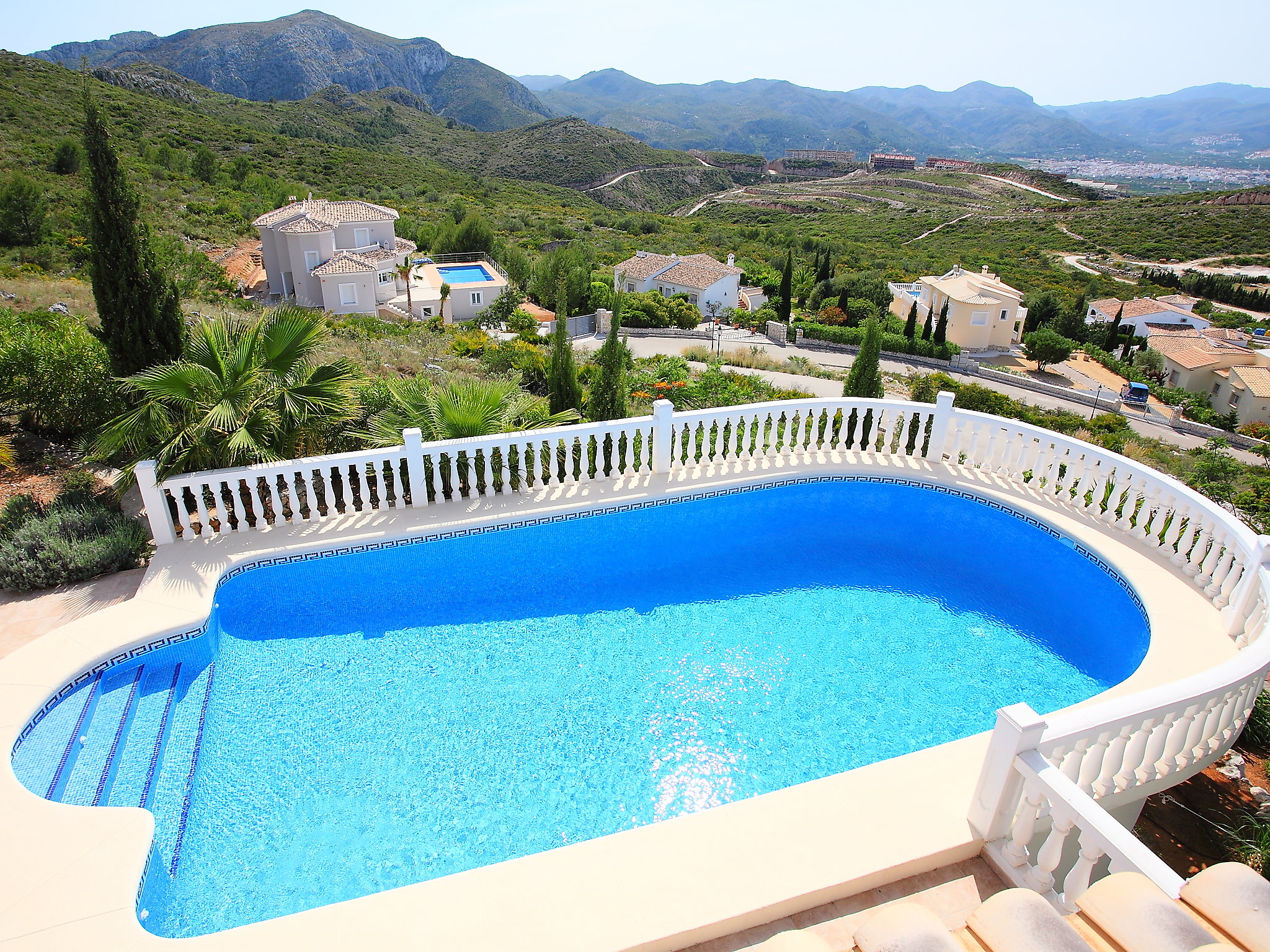Beautiful villa "Puesta del Sol", 2 storeys, built in 2005. In the district of L'Almunia, in a sunny, elevated position, 10 km from the sea. Private: garden 1'100 m2 with wildlife garden and flowers, swimming pool (5 x 10 m, seasonal availability: 01.Jan. - 31.Dec.) with internal staircase. Outdoor shower. In the house: central heating system, burglar alarm system. Shop 8 km, supermarket 6 km, shopping centre 15 km, restaurant 1 km, sandy beach 10 km. Golf course 20 km, tennis 5 km. The owner does not accept any youth groups.Availability