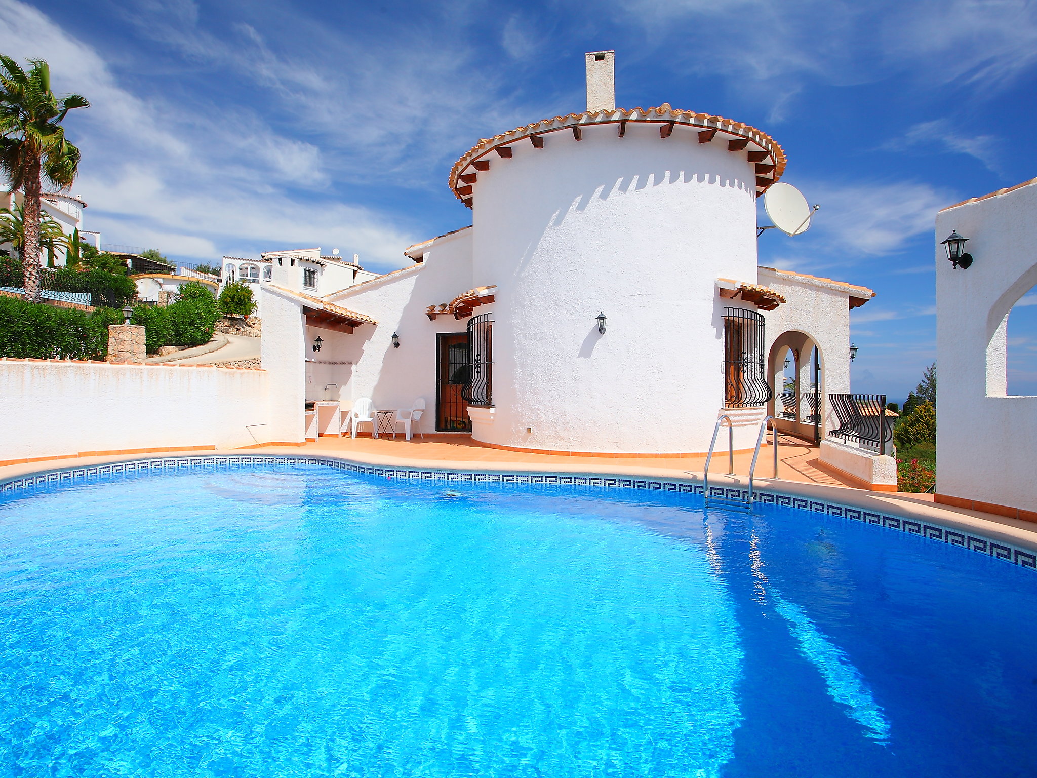 Very beautiful, comfortable villa "Suzanne". In the district of Monte Pego, in a quiet, sunny, elevated position, 8 km from the sea. Private: beautiful, well-kept garden with 800 m2, wildlife garden, flowers and trees, swimming pool kidney shaped (5 x 10 m, 01.01.-31.12.) with internal staircase. Parking on the premises. Shop 6 km, supermarket 6 km, restaurant 1 km, bar 1 km, sandy beach 8 km. Golf course 12 km, tennis 4 km.Availability